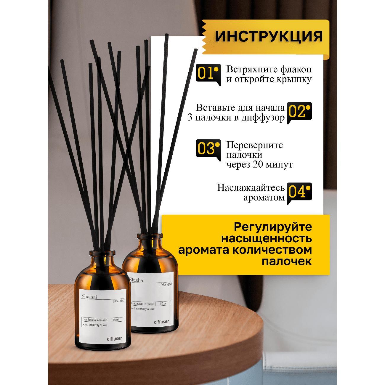 В заказе идут два диффузора, где каждый состоит из стеклянного флакона объемом 50 мл с парфюмированной ароматной жидкостью и 8 фибровых аромапалочек, обладающих большой поглощающей способностью. Особенно удобно то, что Вы сможете сами регулировать интенсивность домашнего освежителя, добавляя или уменьшая количество палочек.