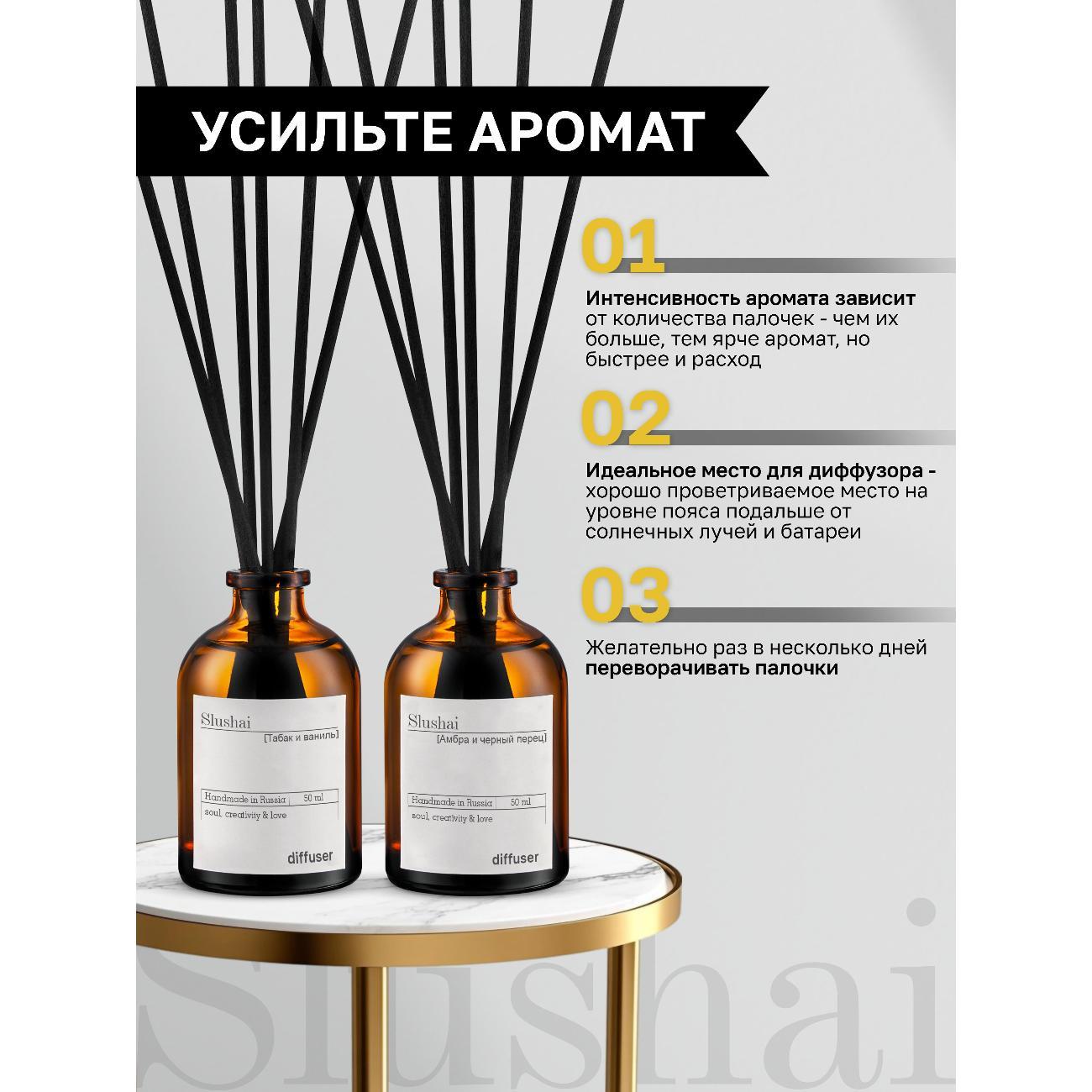 В заказе идут два диффузора, где каждый состоит из стеклянного флакона объемом 50 мл с парфюмированной ароматной жидкостью и 8 фибровых аромапалочек, обладающих большой поглощающей способностью. Особенно удобно то, что Вы сможете сами регулировать интенсивность домашнего освежителя, добавляя или уменьшая количество палочек.