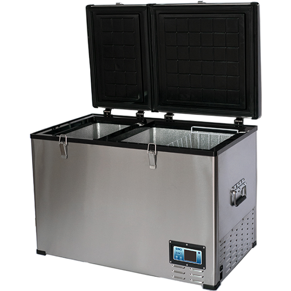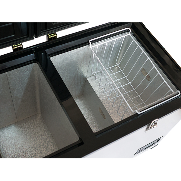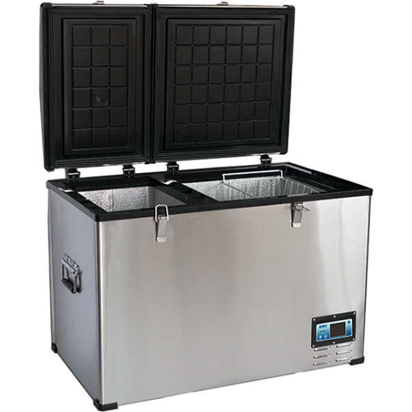 Внутри — две камеры, температура устанавливается в диапазоне от +20 до -20°. Настройки отображает встроенный подсвечиваемый дисплей. Управлять прибором можно как с панели на корпусе, так и со смартфона (Android и iOS). Есть режим «Турбо», который обеспечит быстрое охлаждение или замораживание припасов, и «Эко» для экономичного энергопотребления во время долгой дороги. Светодиодная подсветка предоставляет хороший обзор содержимого.