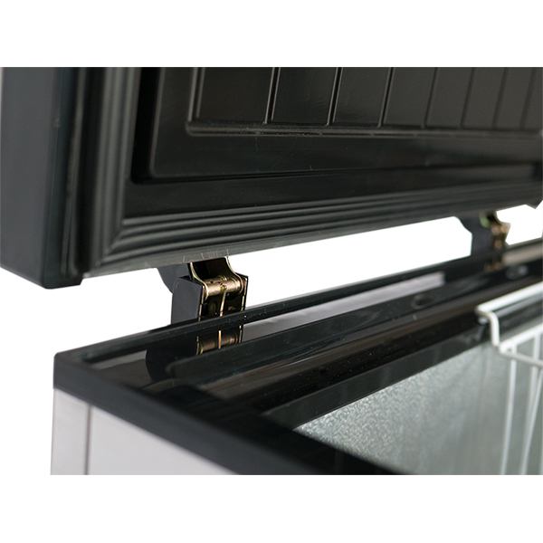 Корпус холодильника выполнен из нержавеющей стали. Крышки, снабженные защелками, откидываются вверх. Для переноса устройство оснащено ручками.