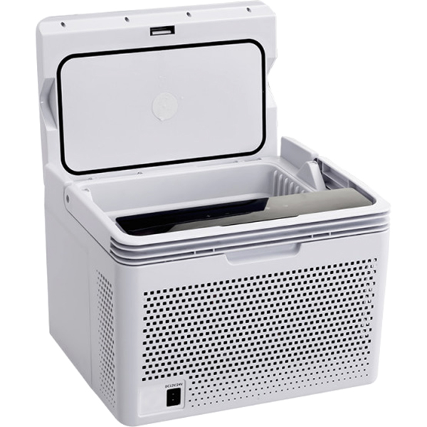 Прибор можно подключить как к штатному прикуривателю (12 В), так и к обычной электрической сети (220 В). Кабель питания съемный. Предусмотрена система защиты от разряда аккумулятора автомобиля. За охлаждение отвечает компрессор, уровень шума при работе составляет 45 дБ. Крышка откидывается вверх, оснащена фиксатором. Для удобства транспортировки есть складная ручка.