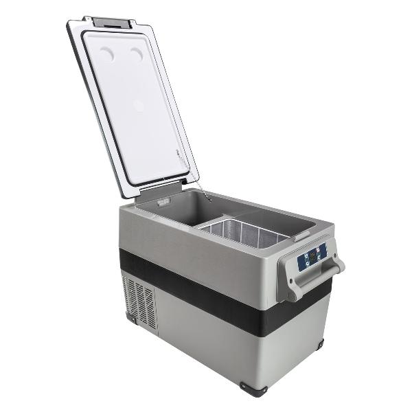 Alpicool CF45 — двухкамерный автомобильный холодильник объемом 45 л. Корпус выполнен из пластика серого цвета. Питание устройство может получать от обычной электросети напряжением 220 В или бортовой линии 12 В (подключается через прикуриватель). В комплекте есть кабель длиной 3,5 м. Подвесная корзина сделана из металла. Прибор оснащен подсветкой. Весит модель 12,86 кг, ее габариты — 46х69х35 см.