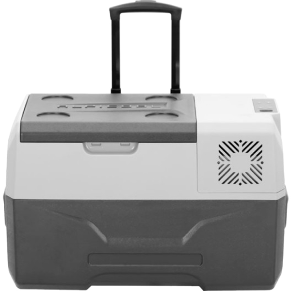 Автохолодильник Alpicool CX30-S — переносная модель, снабженная колесиками, телескопической ручкой и дополнительными ручками по бокам. В съемной крышке есть четыре подстаканника.