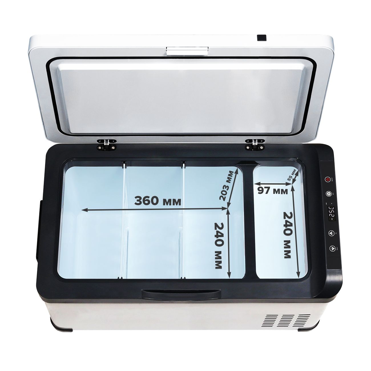 Есть возможность регулировать температуру от минус 25 до плюс 10. Причем регулируется она прям на сенсорном табло. Причем даже память настройки есть, чтоб постоянно не подстраивать все под продукты. В багажнике автомобиля чувствует себя хорошо)