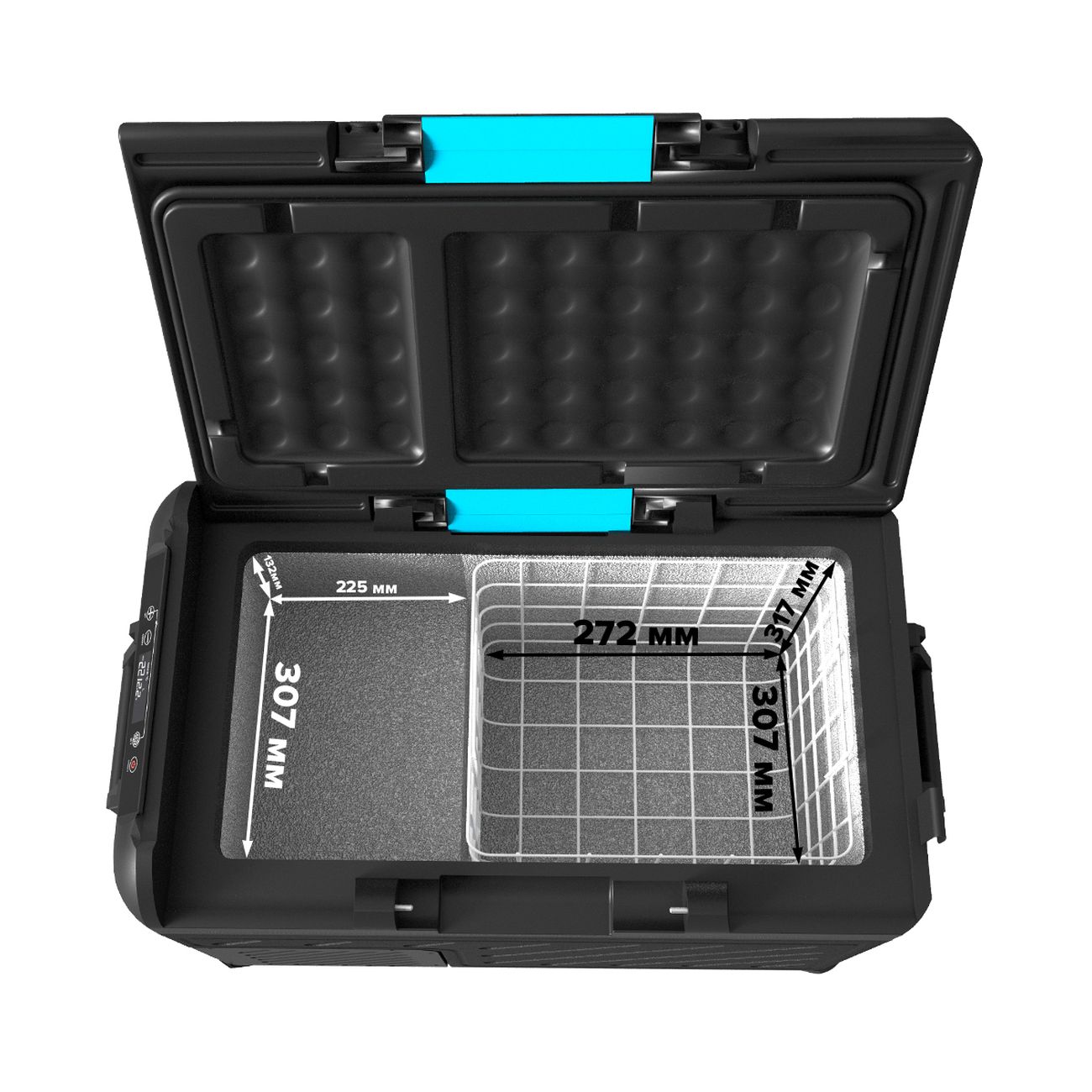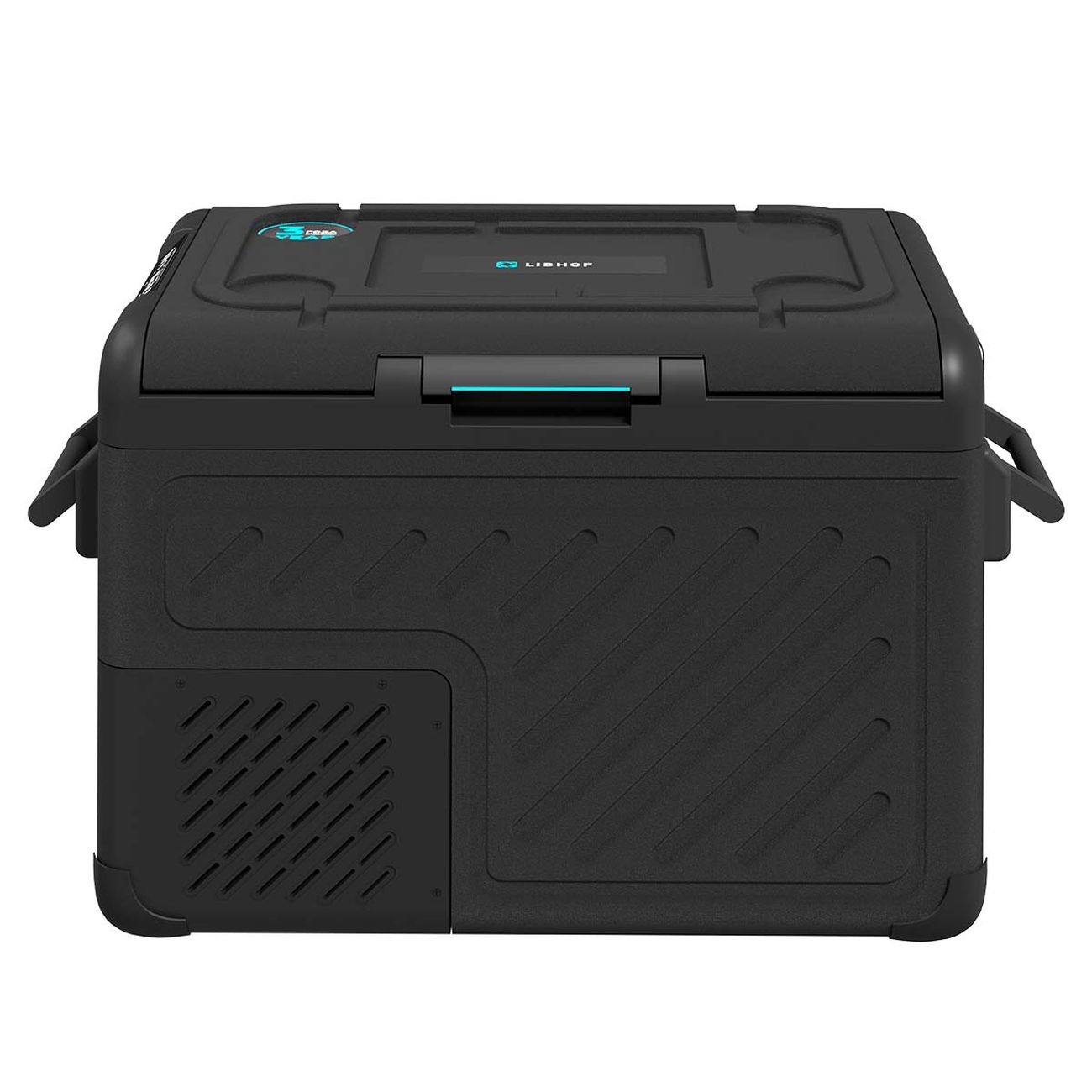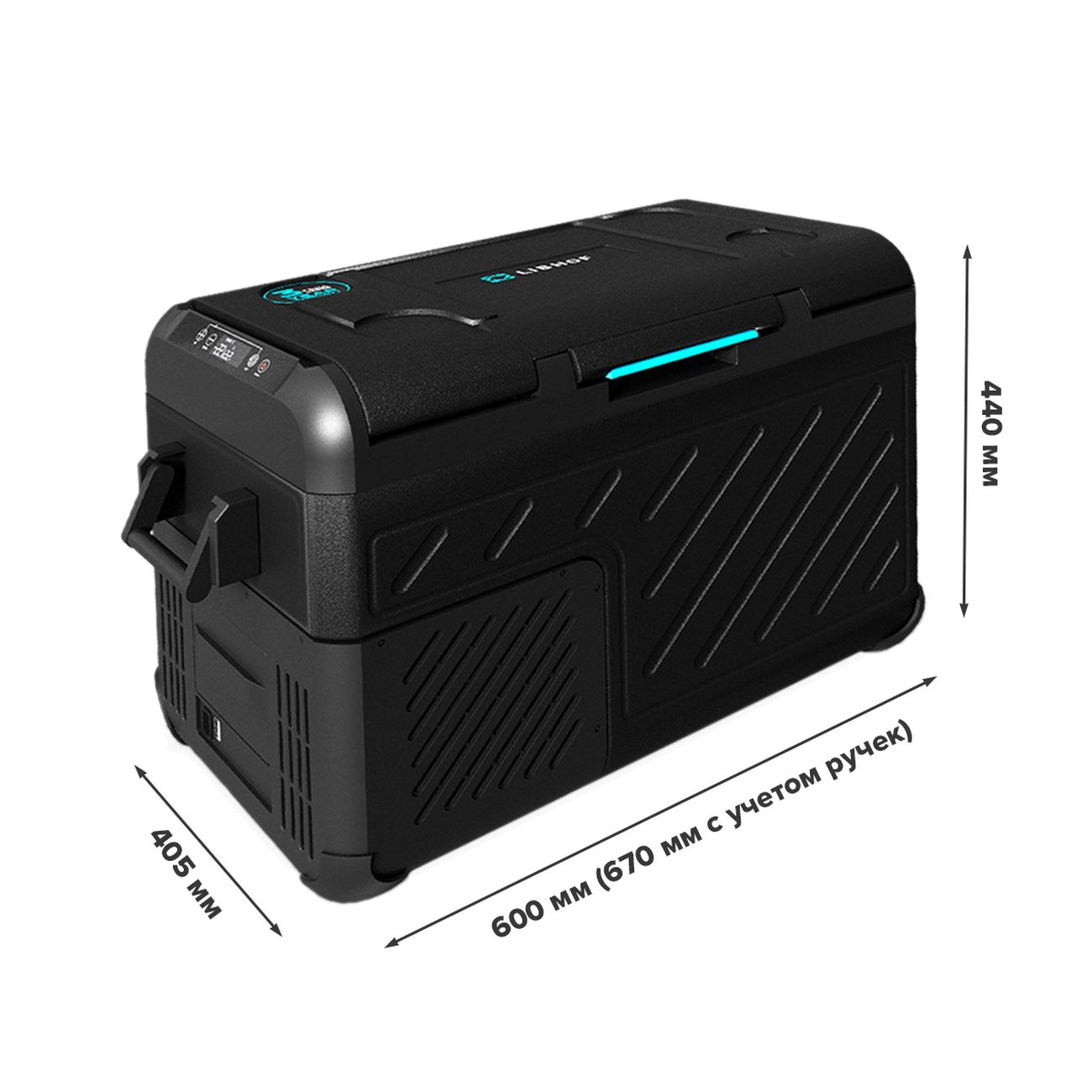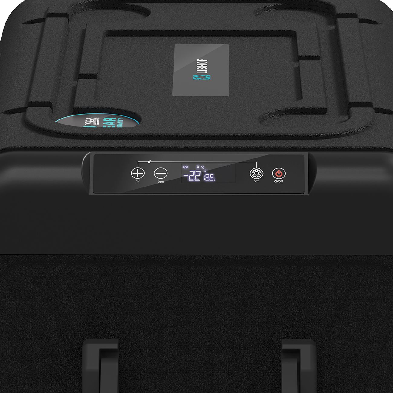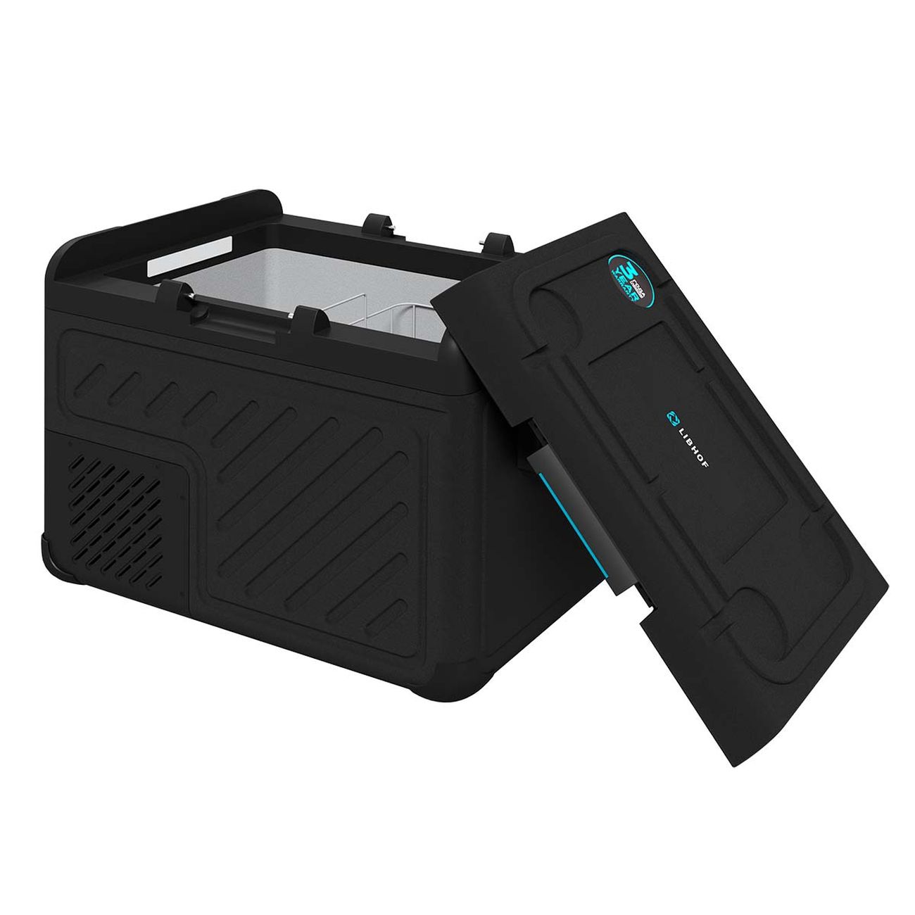 Питание холодильник получает через кабель питания от гнезда прикуривателя с напряжением 12/24 В. Встроенный USB-порт позволяет заряжать мобильные устройства. В автомобиле прибор подключается через прикуриватель. Эта модель оборудована сенсорной панелью управления с дисплеем. Температура регулируется в диапазоне от -22°С до 10°С. В комплект входят формочка для льда, съемная корзина, кабели питания.
