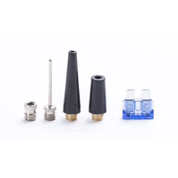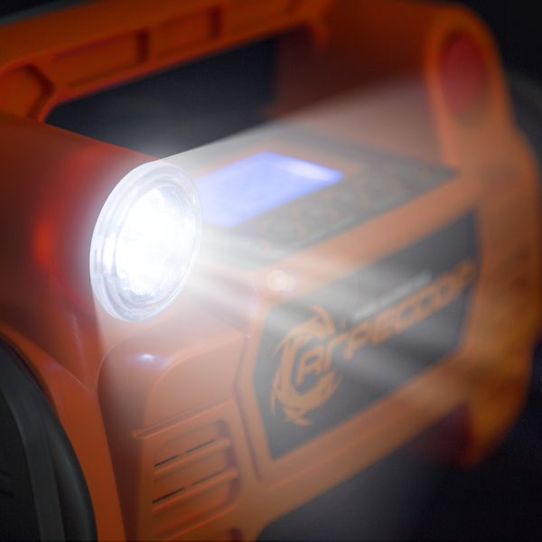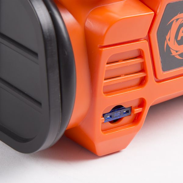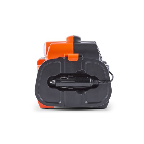 На верхней части пластикового корпуса расположен ЖК-дисплей. Он показывает текущий показатель давления в шинах и отображает процесс накачивания. На нем вручную задается нужный уровень давления. Когда колесо накачается до указанного значения, устройство выключится. Предусмотрен режим контроля заряда аккумулятора и электрогенератора. В комплекте идут четыре переходника для мячей, матрасов и велосипедов. Предельное давление — 10 Атм.
