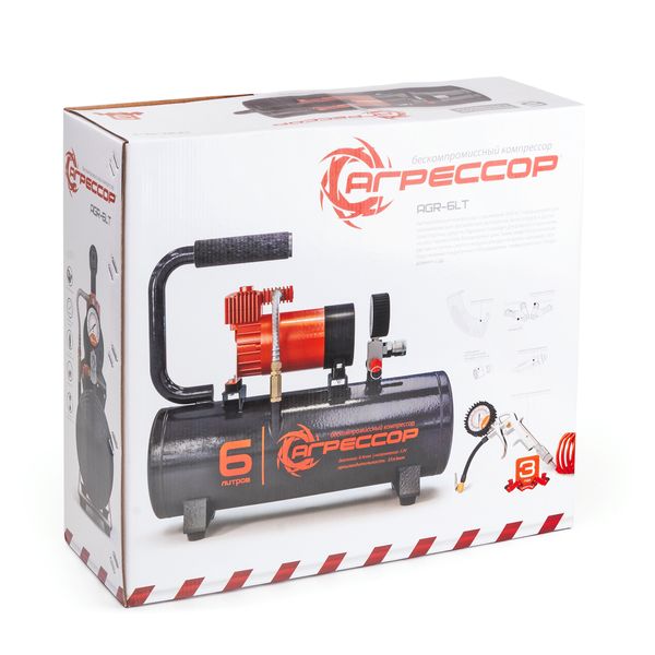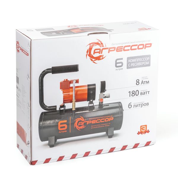 Автомобильный компрессор с ресивером «Агрессор» AGR-6LT оснащен однопоршневым металлическим мотором мощностью 180 Вт. Полное заполнение бака воздухом осуществляется за 4 минуты. Его емкость — 6 л. Есть несколько режимов питания: на клеммы аккумулятора или от бортовой сети через переходник длиной 3 м. Время работы без перегрева двигателя может достигать 30 минут.