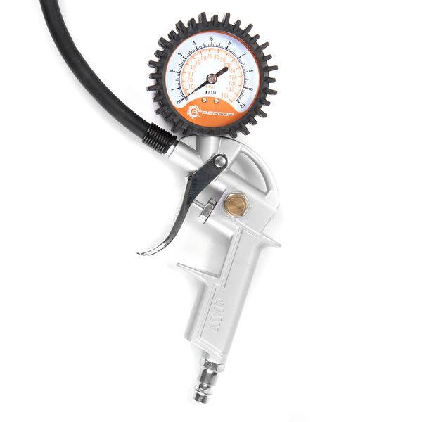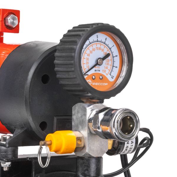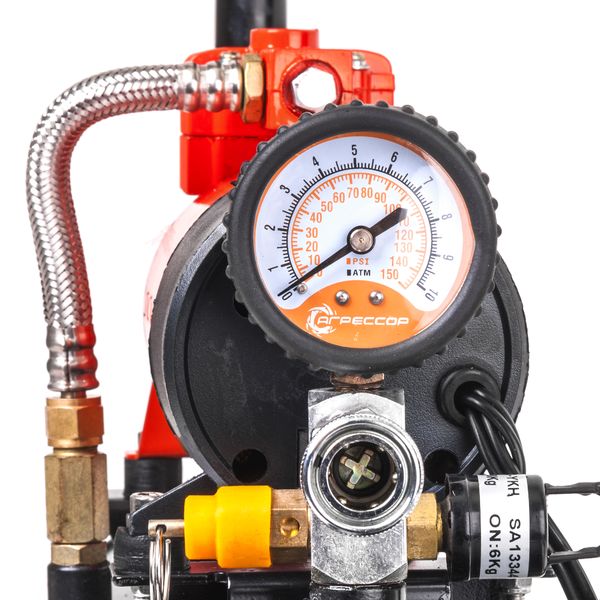 Длина витого воздушного шланга из полиуретана 10 м. Предусмотрен спускной клапан — позволяет регулировать давление в колесах. Корпус из металла устойчив к коррозии. Модель сама отключается при полном заполнении ресивера. На ручке установлен аналоговый манометр. С его помощью можно контролировать уровень давления в процессе подкачки.