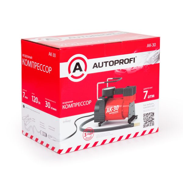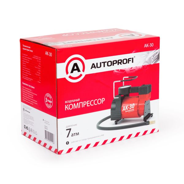 AutoProfi AK-30 — автомобильный компрессор с поршневым мотором. Подойдет для легковых машин. Встроенный манометр позволяет контролировать давление в шинах во время подкачки. Производительность устройства — 30 л/мин. Мощность — 120 Вт. Может работать беспрерывно до 20 минут. Длина зарядного шнура равна 3 м, шланга — 1 м.