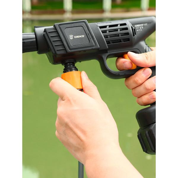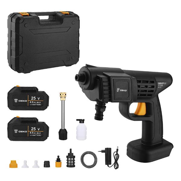 Автомойка Deko DKCW25 поставляется двумя аккумуляторами емкостью 4 А*ч. Прибор с двигателем мощностью 1 л.с. потребляет 650 Вт. Устройство обеспечивает подачу струи под давлением 30 бар, что позволяет быстро очистить стойкие загрязнения. Модель отличается высокой производительностью, равной 4750 л/мин, расход используемого моющего средства — 0,35 л/мин. Уровень шума не превышает 90 дБ.