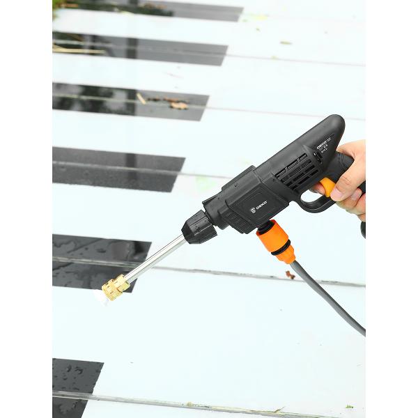 Корпус из ABS-пластика дополнен съемным резервуаром объемом 0,35 л. Аппарат подключается к водопроводу с помощью шланга длиной 5 м. Доступен забор из открытых емкостей. Максимальная температура воды — 40°C. В комплектацию входят пистолет с креплением, выдерживающим сильный напор, две насадки, в том числе распылитель. Изделие весит 2,21 кг. Габариты — 13х29,5х34 см.