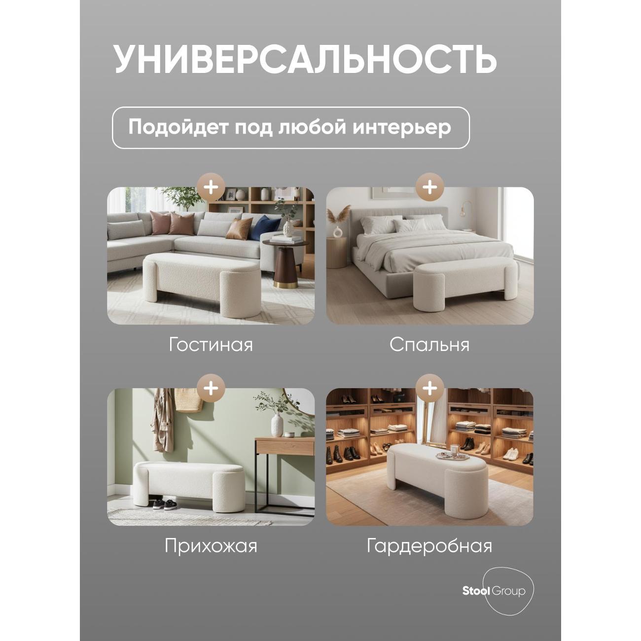 Банкетка из букле овальной формы создаёт мягкое и комфортное посадочное место, которое легко вписывается в разные зоны дома. Благодаря приятной на ощупь обивке и лаконичной геометрии она подходит как прикроватная банкетка в спальню, выполняя функцию удобного сиденья и аккуратного дополнения к мебели. В сочетании с другими мягкими элементами изделие можно использовать в составе комплектов, где выбирают банкетки и пуфы в спальню, формируя гармоничную и практичную спальную зону. При размещении у изножья кровати банкетка выступает как часть набора банкетки для кровати, поддерживая единую стилистику помещения.