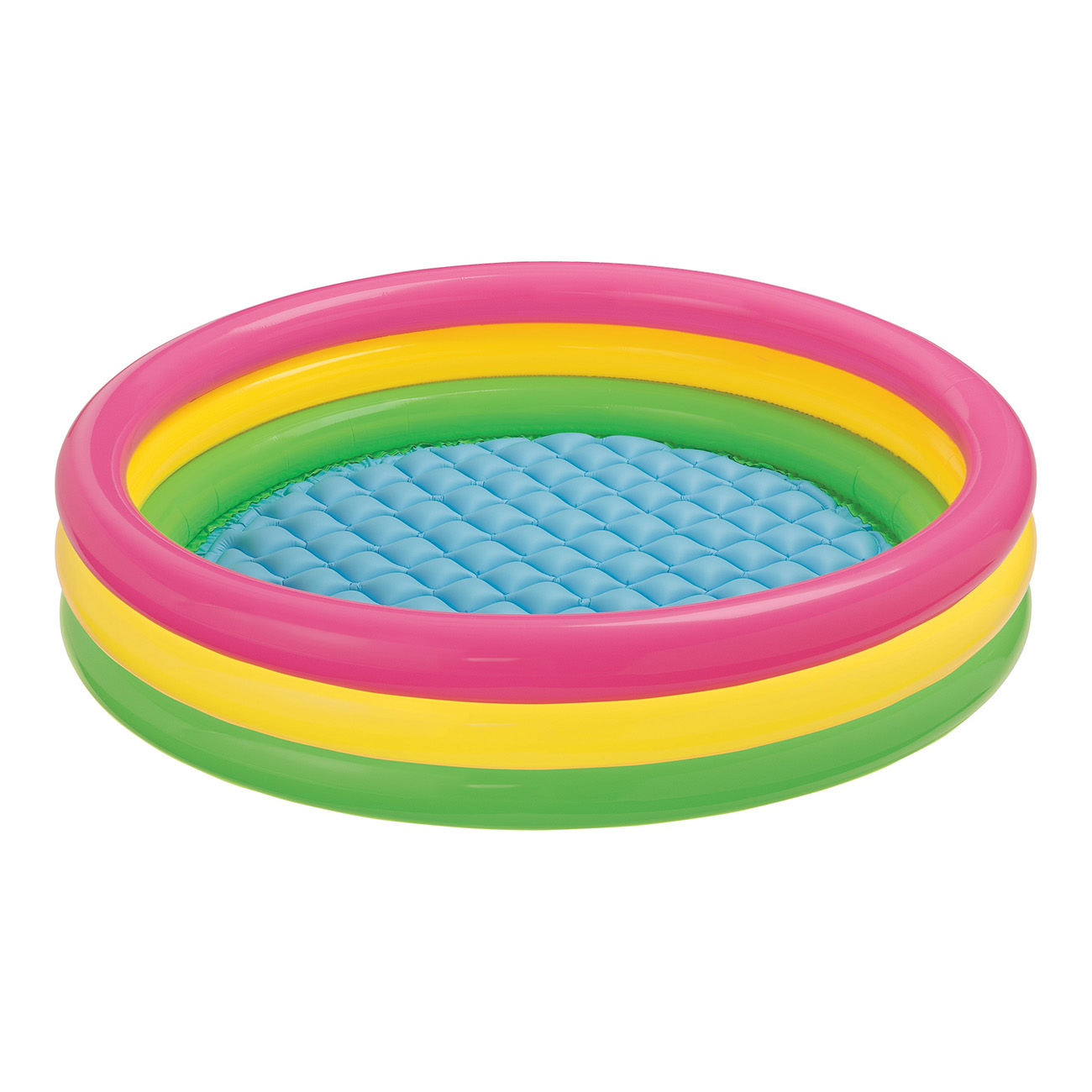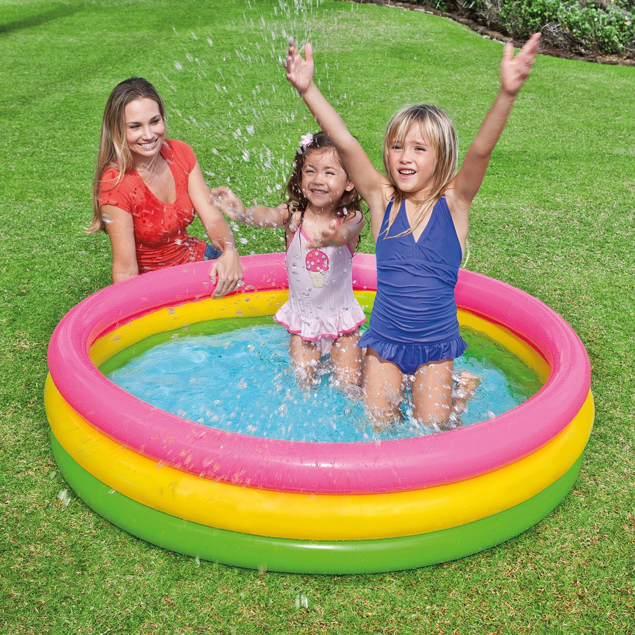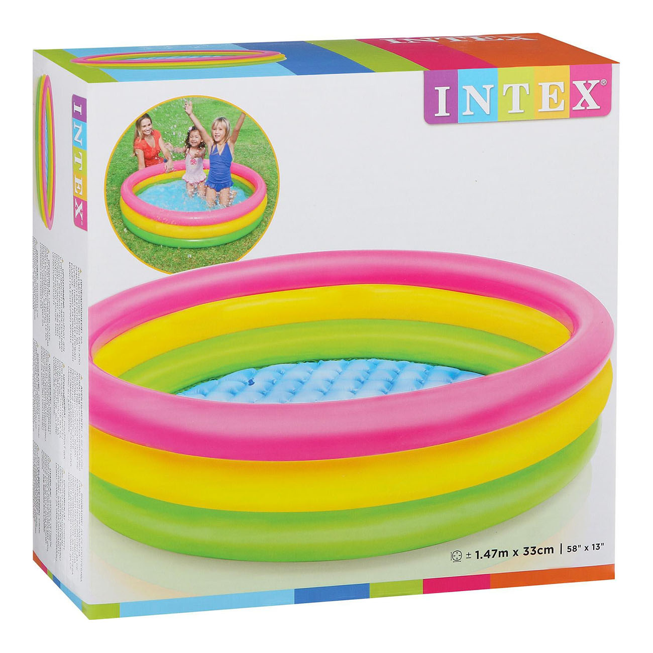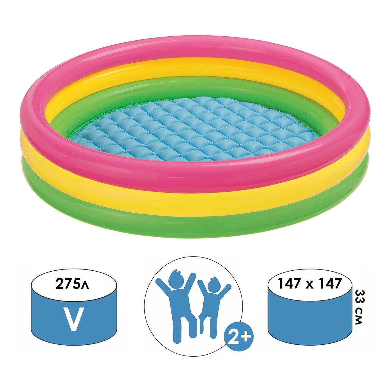 Бассейн Intex «Радуга» рассчитан на детей старше 2 лет. Его диаметр — 147 см. Мягкие надувные бортики и дно защищают малышей от травм. В резервуар вмещается 299 л воды, его глубина — 33 см. Винил, из которого выполнена конструкция, устойчив к проколам и растяжениям. Весит модель 1,8 кг.