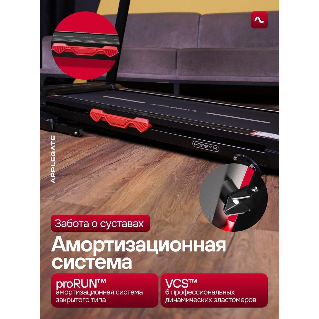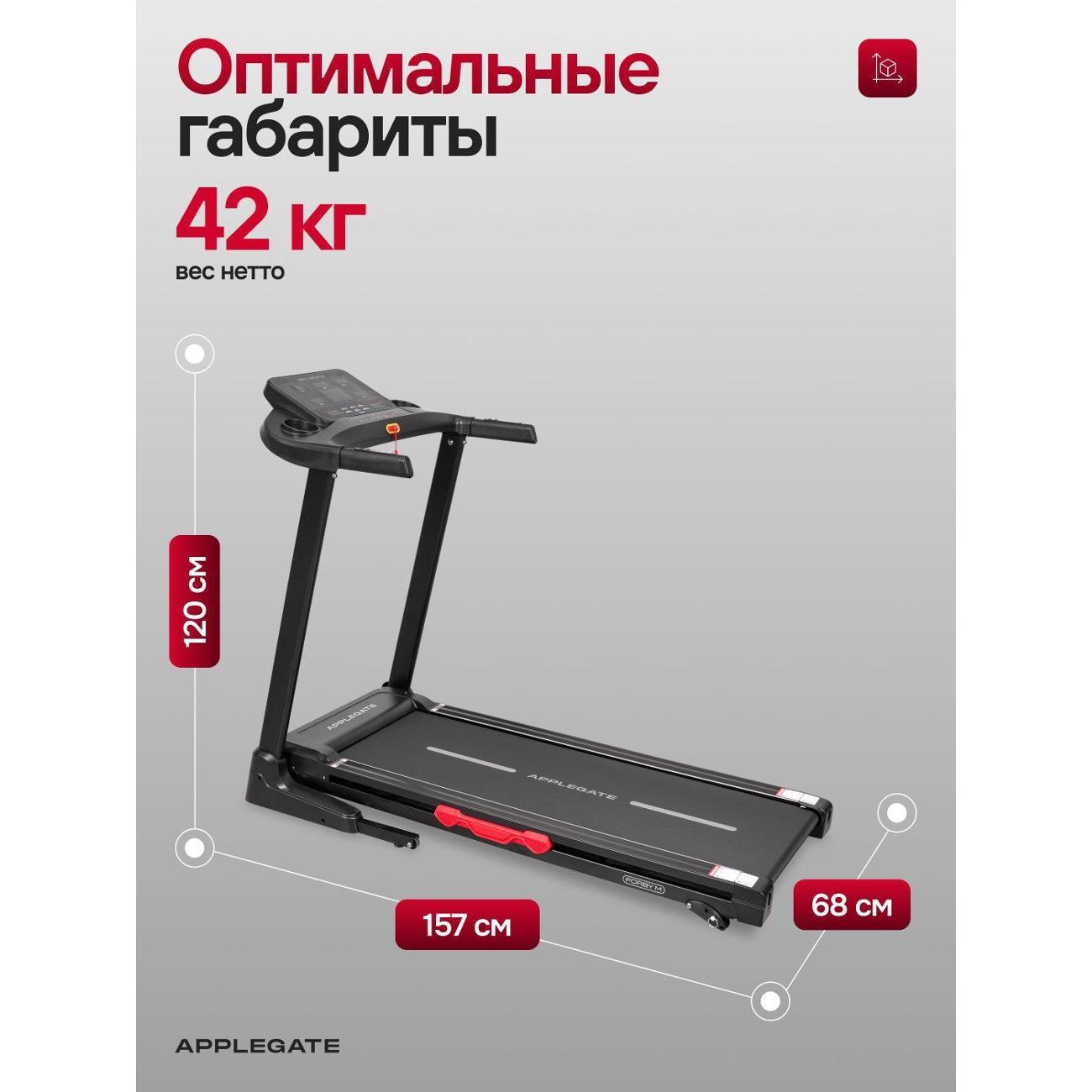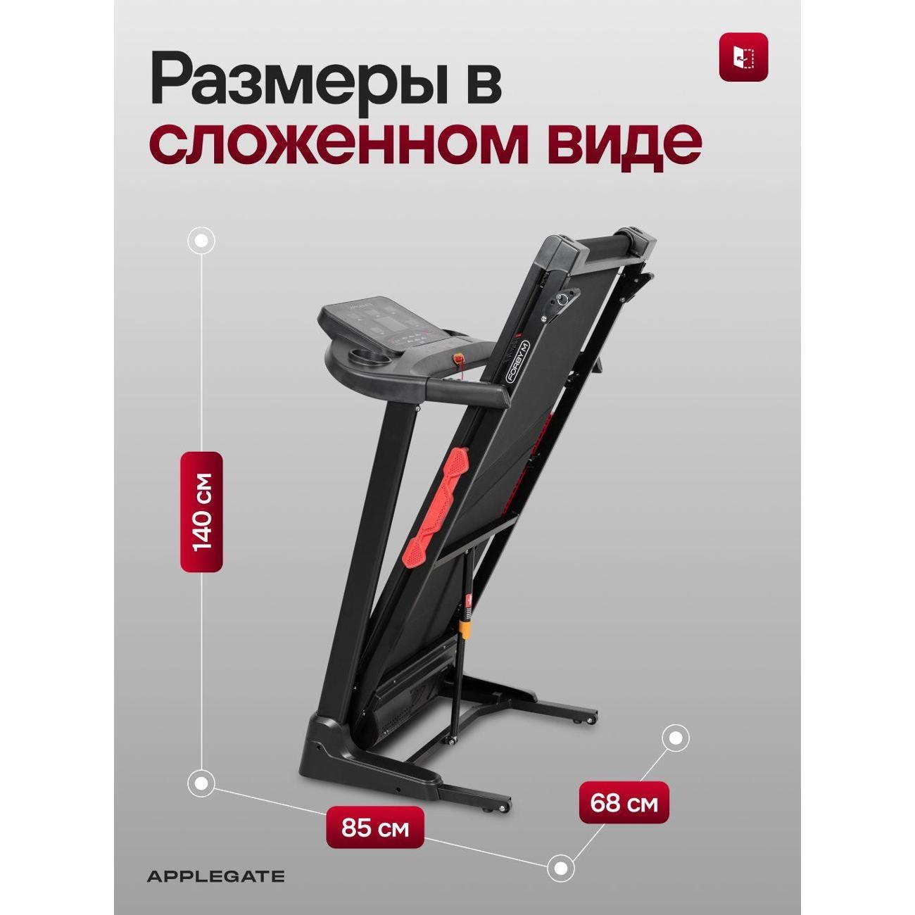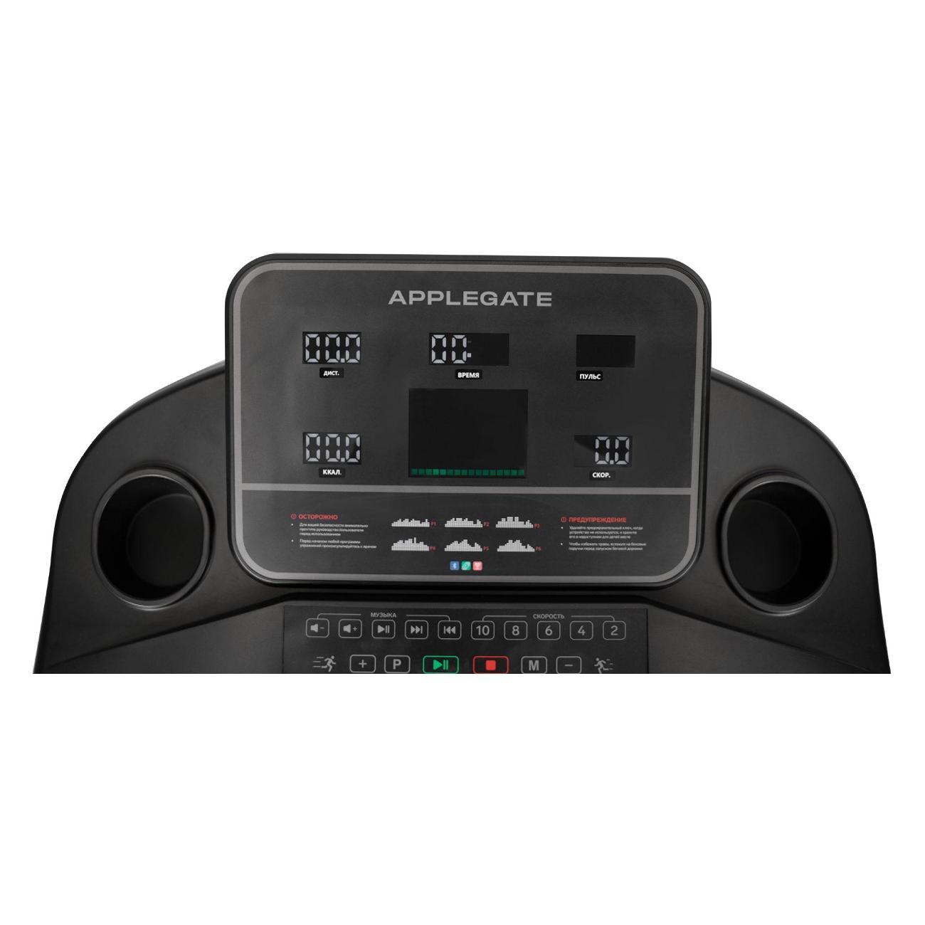 Беговая дорожка Applegate Forby_M подходит для домашнего использования и для эксплуатации в условиях фитнес-клуба. Модель оснащена 22 программами, в каждой из которых предустановлены определенные настройки. Четыре демпфирующие подушки Cushion делают занятия более комфортными при разной интенсивности ходьбы или бега. Чтобы разнообразить тренировку, можно поднять полотна, выбрав один из трех уровней. Длина полотна составляет 120 см, ширина — 42 см.