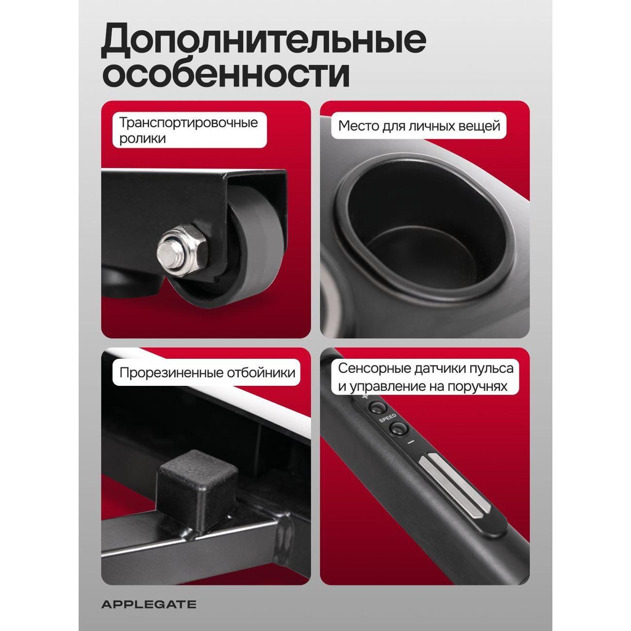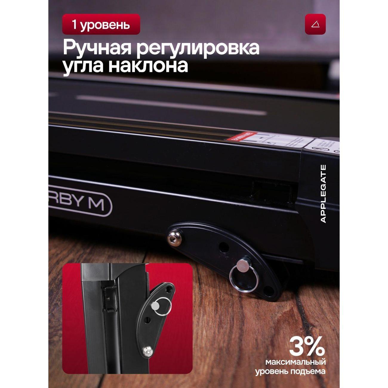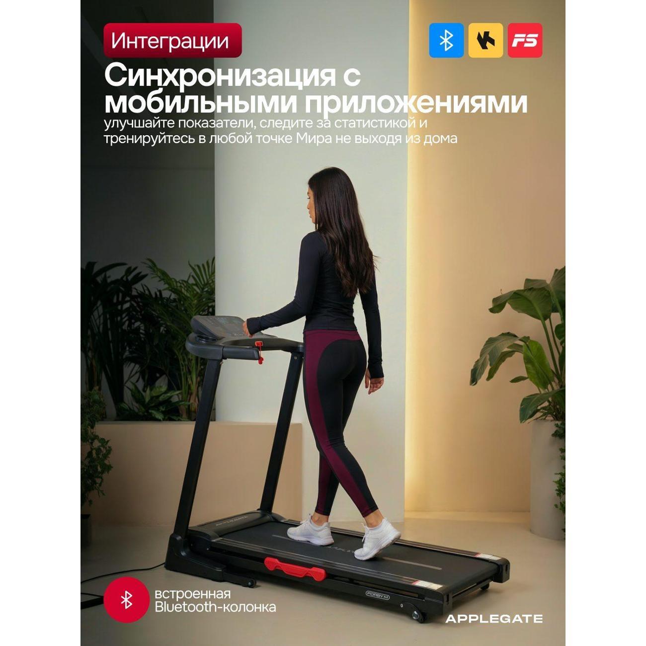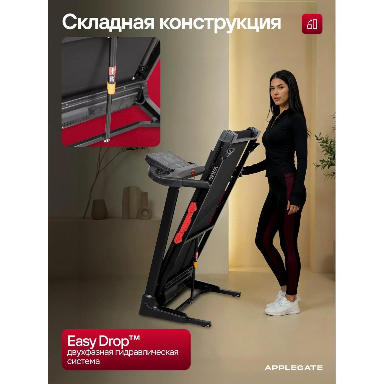 Беговая дорожка Applegate Forby_M подходит для домашнего использования и для эксплуатации в условиях фитнес-клуба. Модель оснащена 22 программами, в каждой из которых предустановлены определенные настройки. Четыре демпфирующие подушки Cushion делают занятия более комфортными при разной интенсивности ходьбы или бега. Чтобы разнообразить тренировку, можно поднять полотна, выбрав один из трех уровней. Длина полотна составляет 120 см, ширина — 42 см.