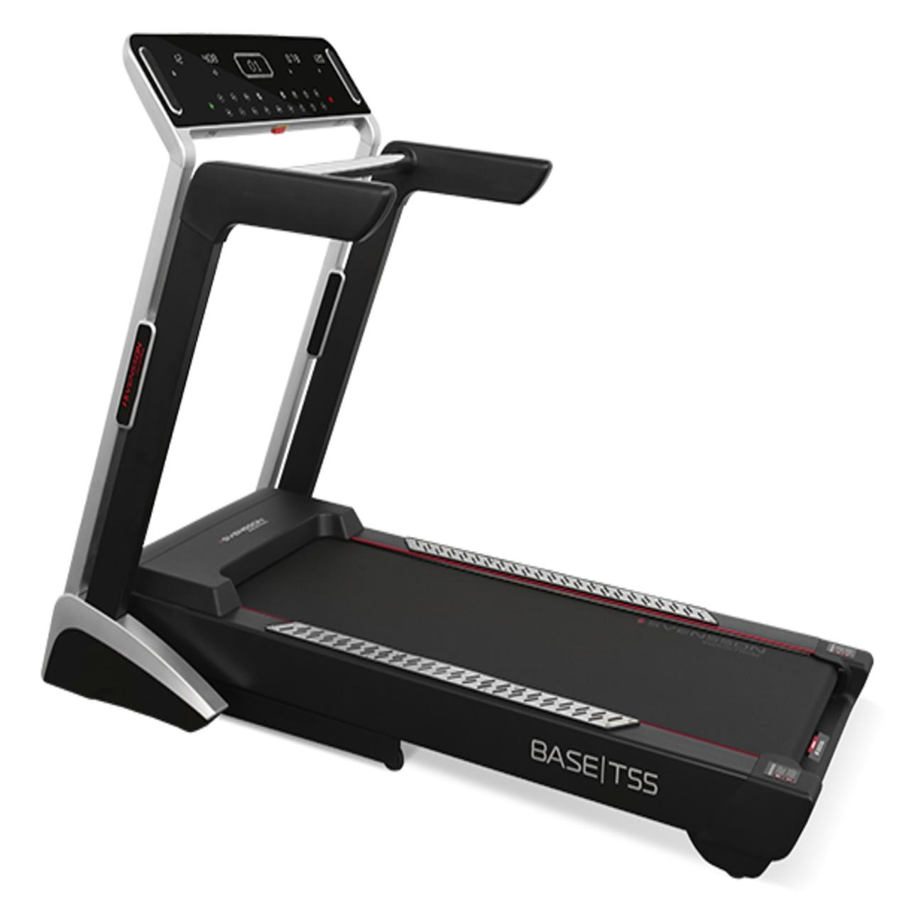 Беговая дорожка Svensson Industrial Base T55 рассчитана на вес 160 кг. Она оснащена американским двигателем Leeson мощностью 3,75 л.с., который разгоняет ее до 20 км/ч. Прибор представлен основным дисплеем и четырьмя дополнительными. Управление осуществляется через сенсорные кнопки.