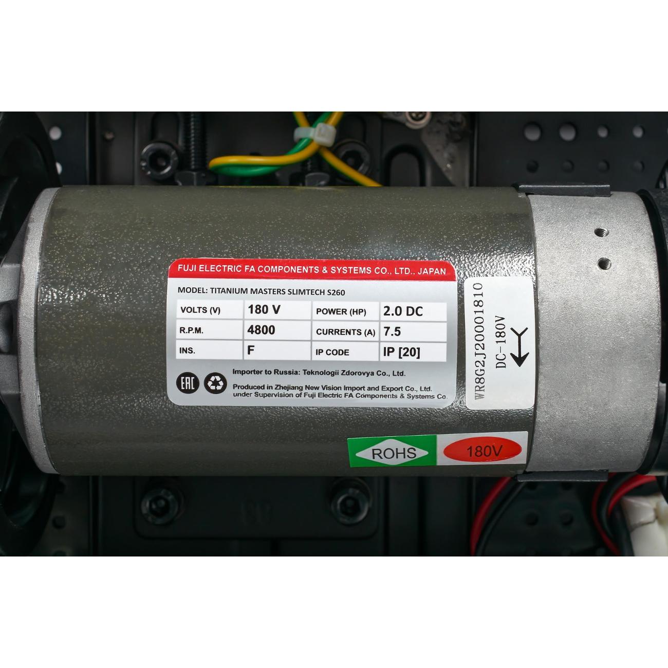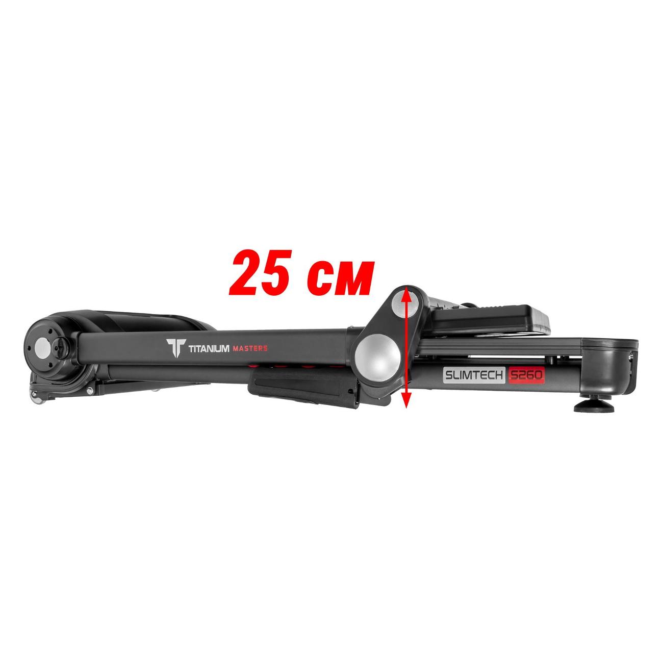 Беговая дорожка Titanium Masters Slimtech S260 питается от сети 220 В. Мотор с 2,25 л.с. приводит в движение полотно — максимальный показатель достигает 16 км/ч. Угол наклона регулируется в пределах 15% за счет электромеханизма. Система амортизации обеспечивает комфортное занятие спортом. Модель размером 164х79х30 см и весом 57 кг выдерживает нагрузку до 120 кг.