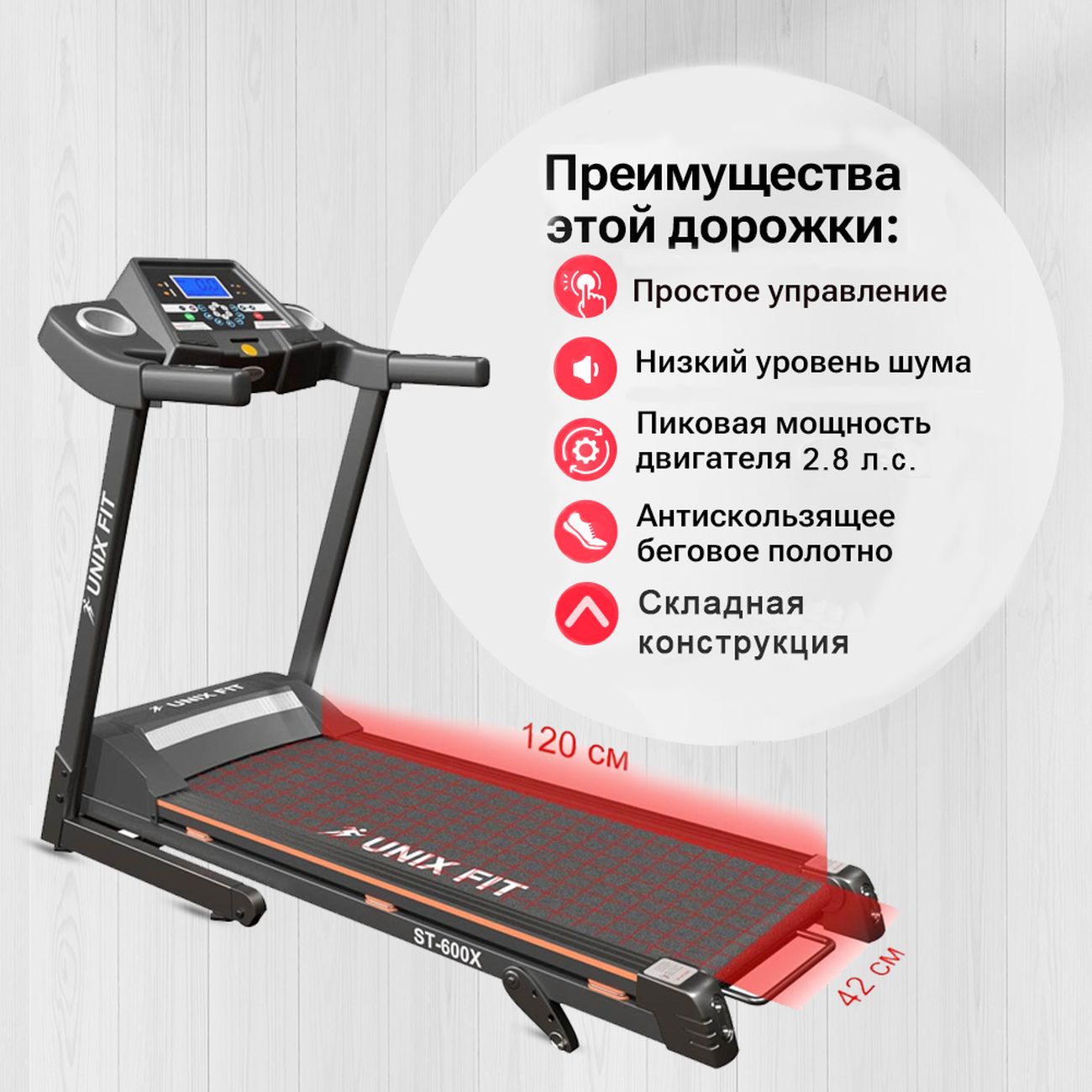 Беговая дорожка UnixFit ST-600X — это домашний спортивный модуль с возможностью настройки нагрузок. Тренажер можно использовать как для легкой пробежки, так и для интенсивной ходьбы с заданной скоростью, которая может достигать 9 км/ч. У прибора корректируется угол наклона, так что вы можете прокачивать мышцы ног при активном подъеме в гору.