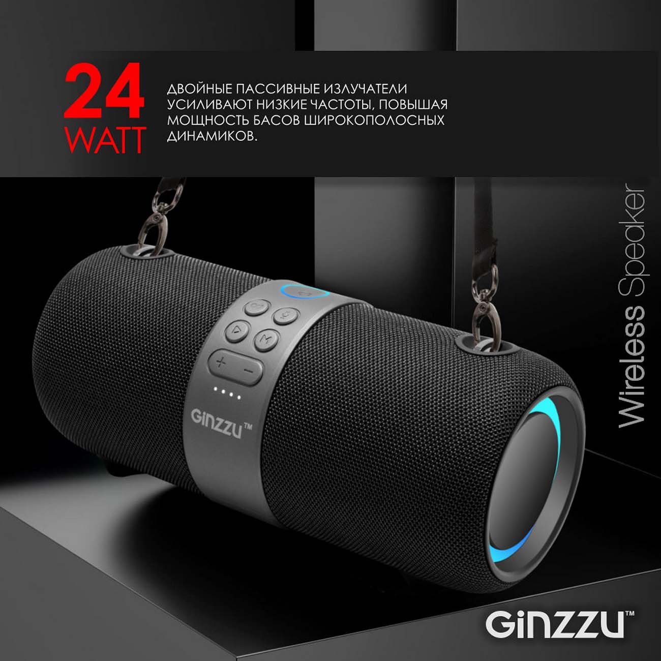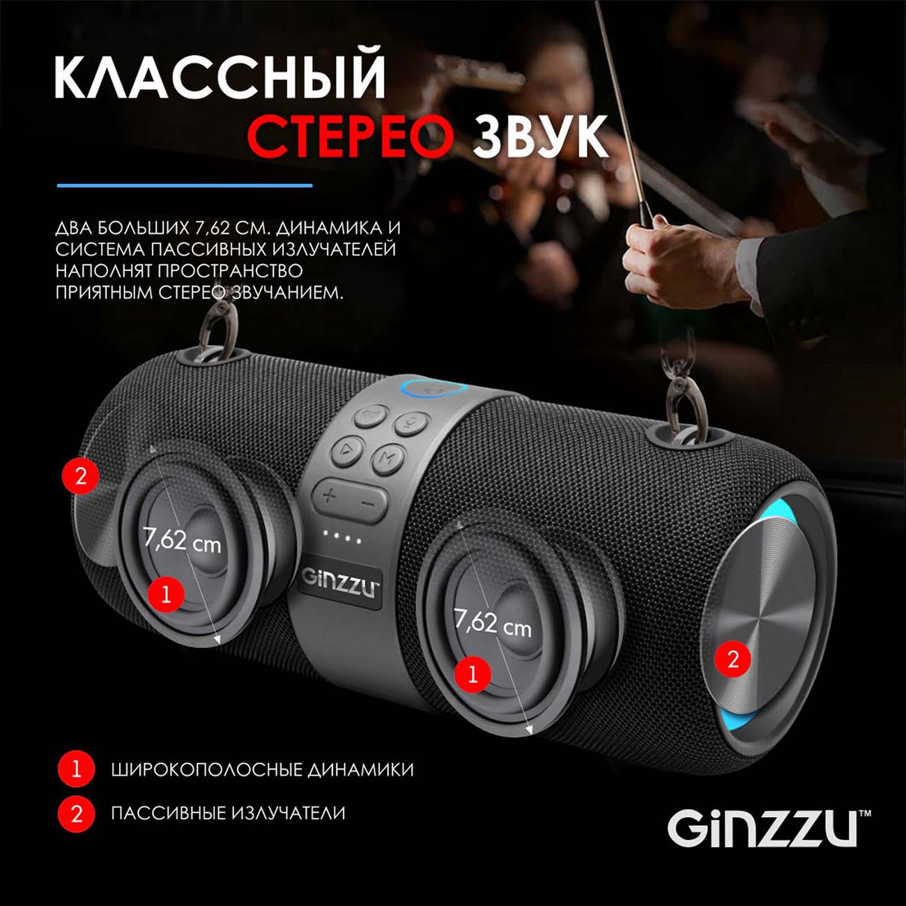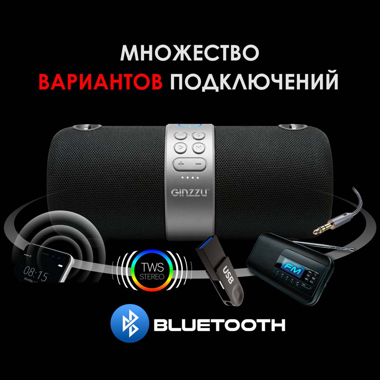 Беспроводная акустика Ginzzu выходной мощностью 24 Вт поддерживает режимы Handsfree, Siri Voice Control, Google Assistant, что дает возможность управлять ей голосом. Опция TWS позволяет подключать беспроводные наушники.