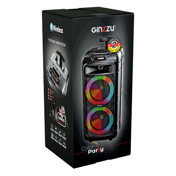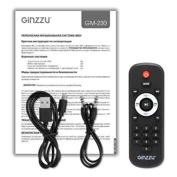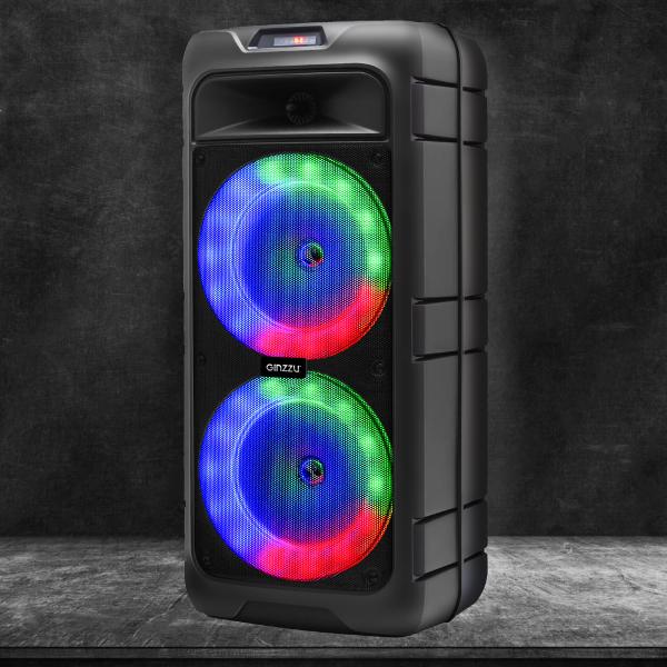 Беспроводная акустическая система Ginzzu GM-230 — колонка мощностью 48 Вт с двумя динамиками, выполненная в черном пластиковом корпусе с RGB-подсветкой.