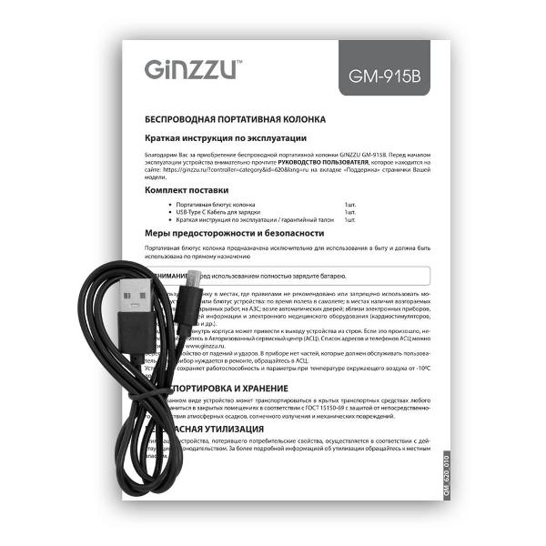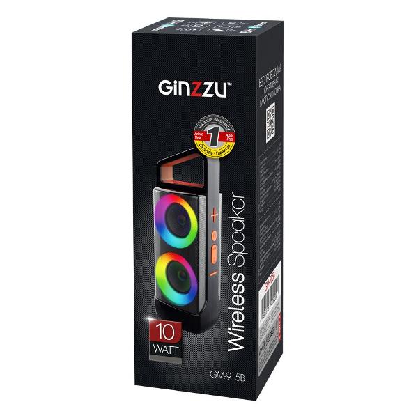 Беспроводная акустика Ginzzu GM-915B со встроенным сабвуфером и фронтальными акустическими системами мощностью 5 Вт получают данные формата МР3 для воспроизведения через Bluetooth 5.1. На черном корпусе, выполненном из пластика и металла, встроены интерфейсы 3,5 мм аудио, USB, слот microSD. Предусмотрена защита от брызг. Доступна подсветка. Электропитание обеспечивается аккумулятором Li-Ion емкостью 1500 мА*ч. Заряд аккумулятора до 100% восполняется за 3 ч. В комплектацию включен кабель USB Type-C. Габариты: 250х90х70 мм. Цвет — черный. Общая масса составляет 630 г.