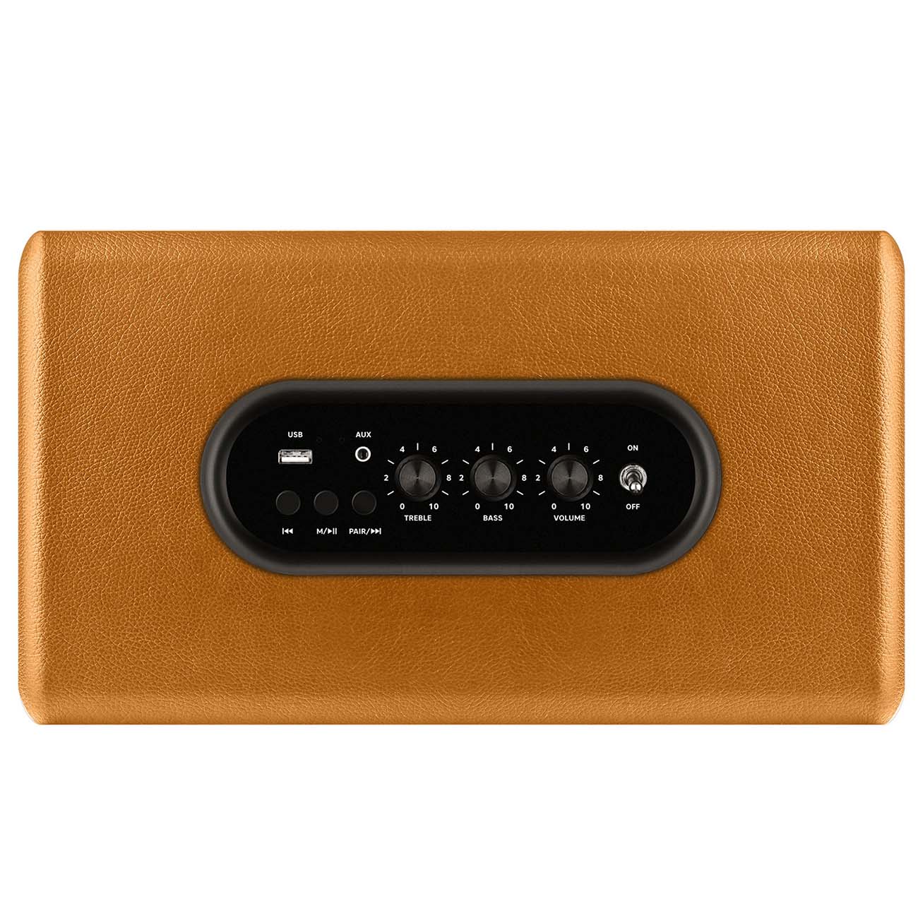 Панель управления колонкой удобно расположена в верхней части корпуса. На ней – тумблер, отвечающий за включение и выключение, поворотные регуляторы громкости и уровня высоких и низких частот и кнопки, с помощью которых вы будете управлять воспроизведением.
