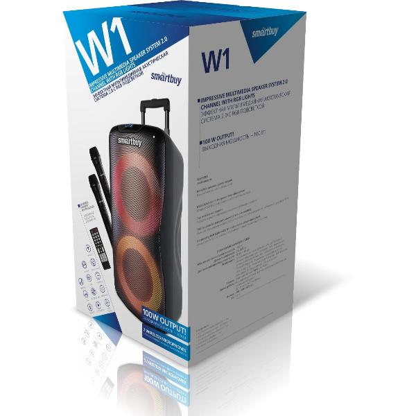 Беспроводная акустика Smartbuy W1 обладает двумя динамиками мощностью 100 Вт, которые выдают разнонаправленное звучание. Рабочий диапазон варьируется от 50 Гц до 20000 Гц. Эквалайзер дает возможность настраивать звук. Устройство поддерживает воспроизведение радиостанций FM-диапазона и караоке. Предусмотрена громкая связь.