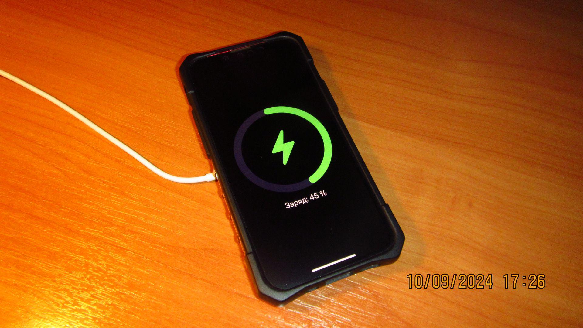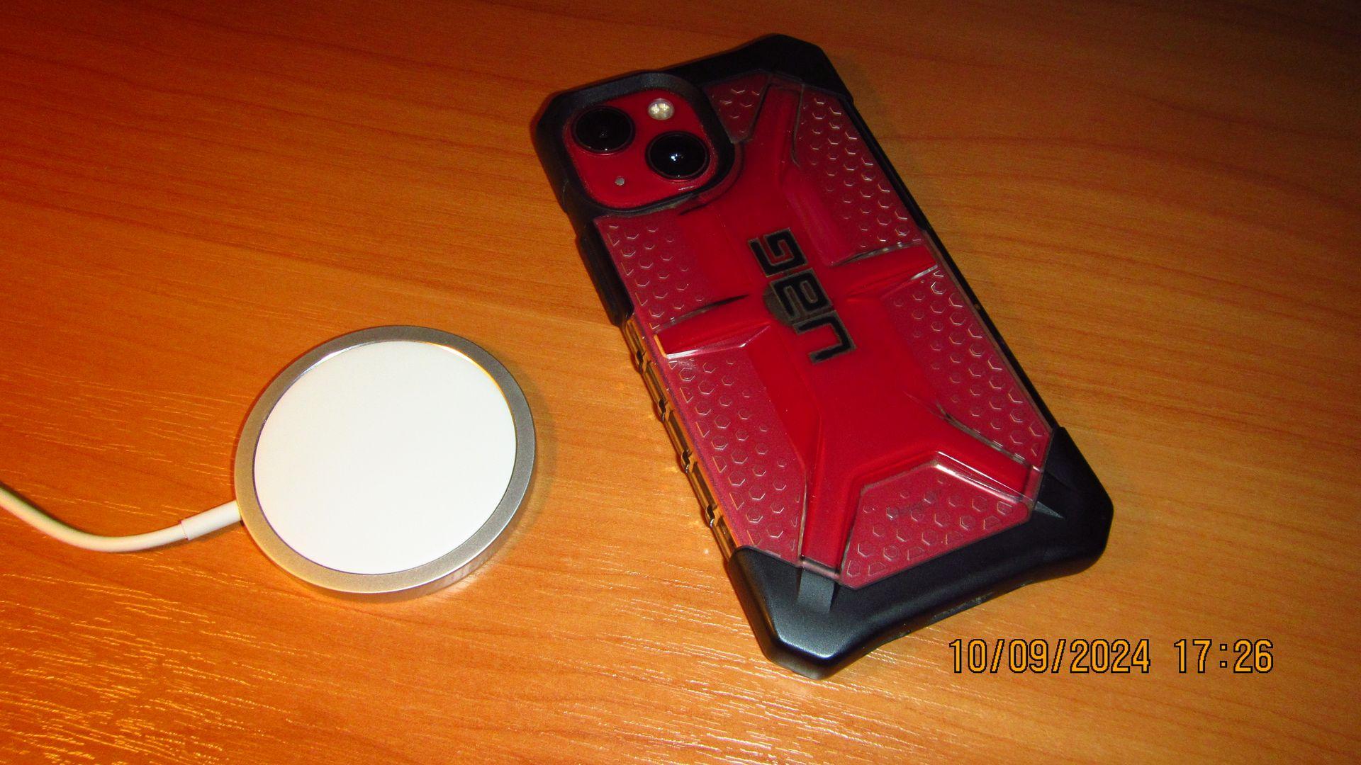 Работает! И очень хорошо работает! Через чехол UAG, а он не совсем тоненький, зарядка происходит, конечно, не так быстро как через проводную, но вполне приемлемо, приблизительно 1% в минуту, может чуть больше минуты. Основное требование при покупке устройства было такое: не нужно ничего тыкать в смартфон!