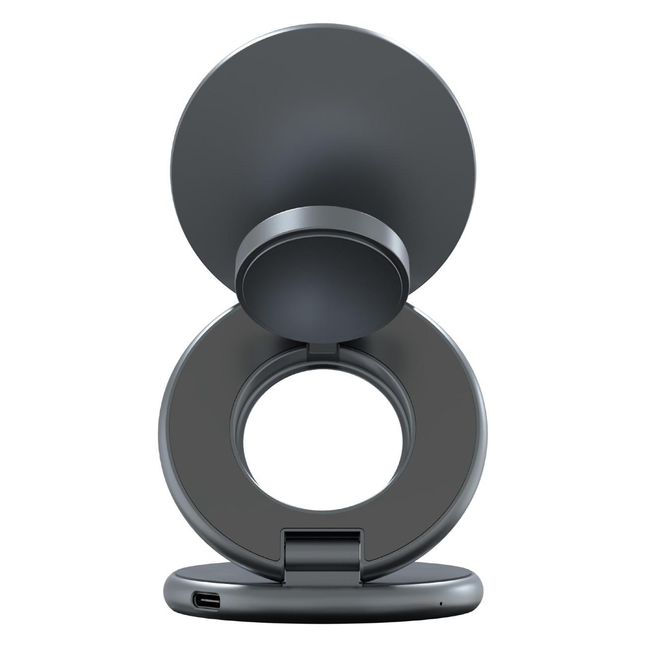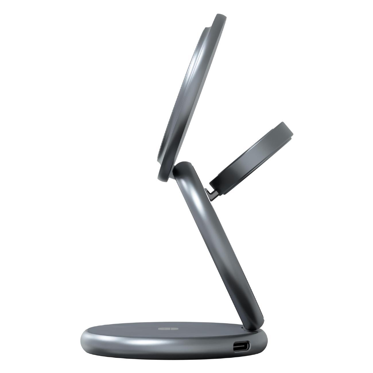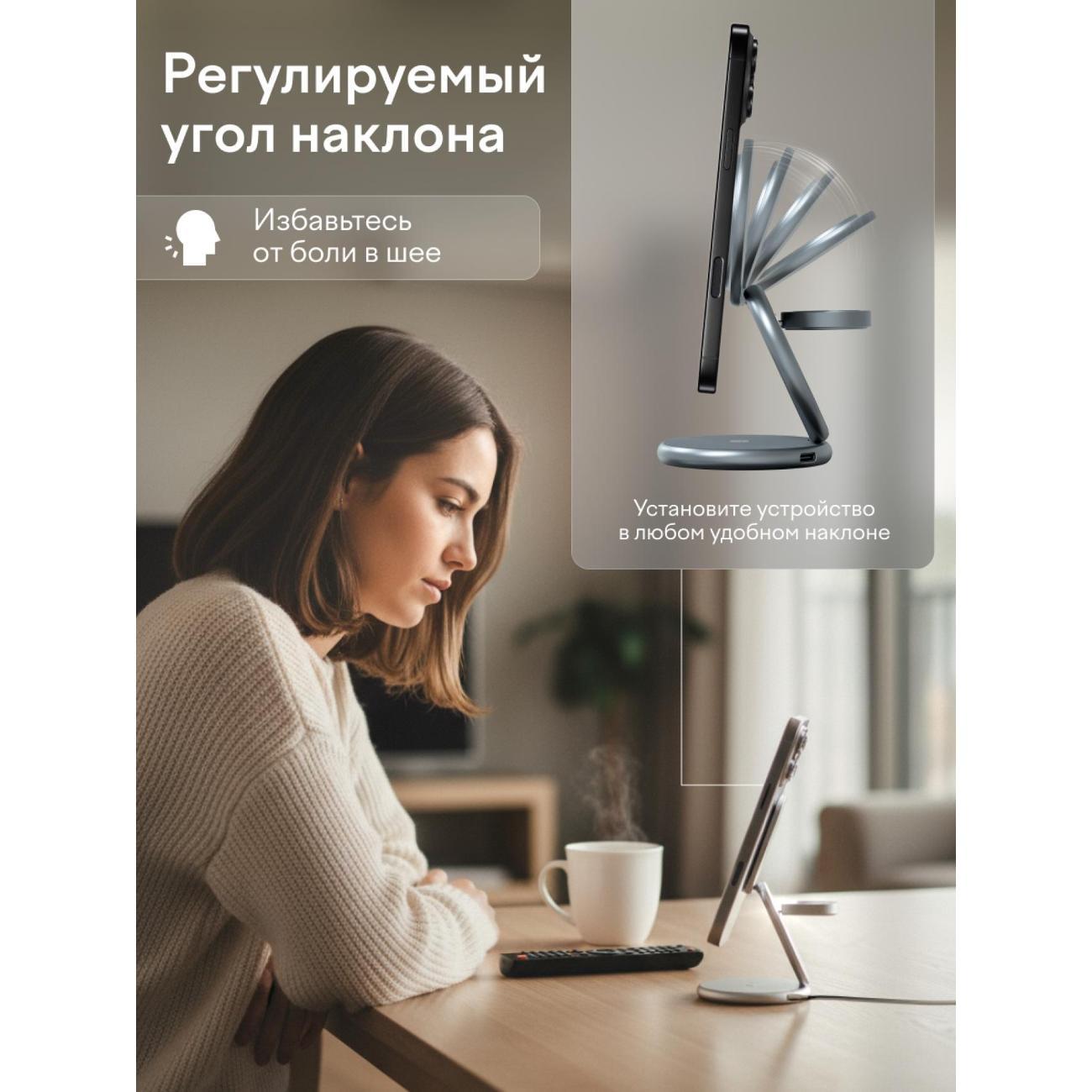 Конструкция позволяет разместить и заряжать смартфон, часы Apple Watch и наушники AirPods в одно время. Магнитное крепление класса N52 обеспечивает надежную фиксацию устройств даже при наклоне основания. Регулируемый угол наклона способствует удобному просмотру уведомлений на экране во время зарядки.