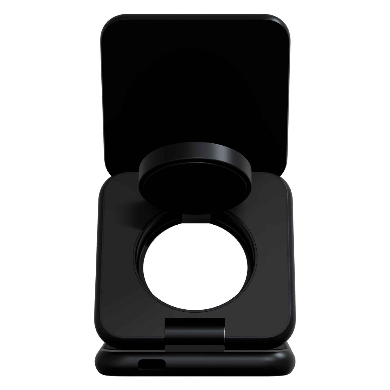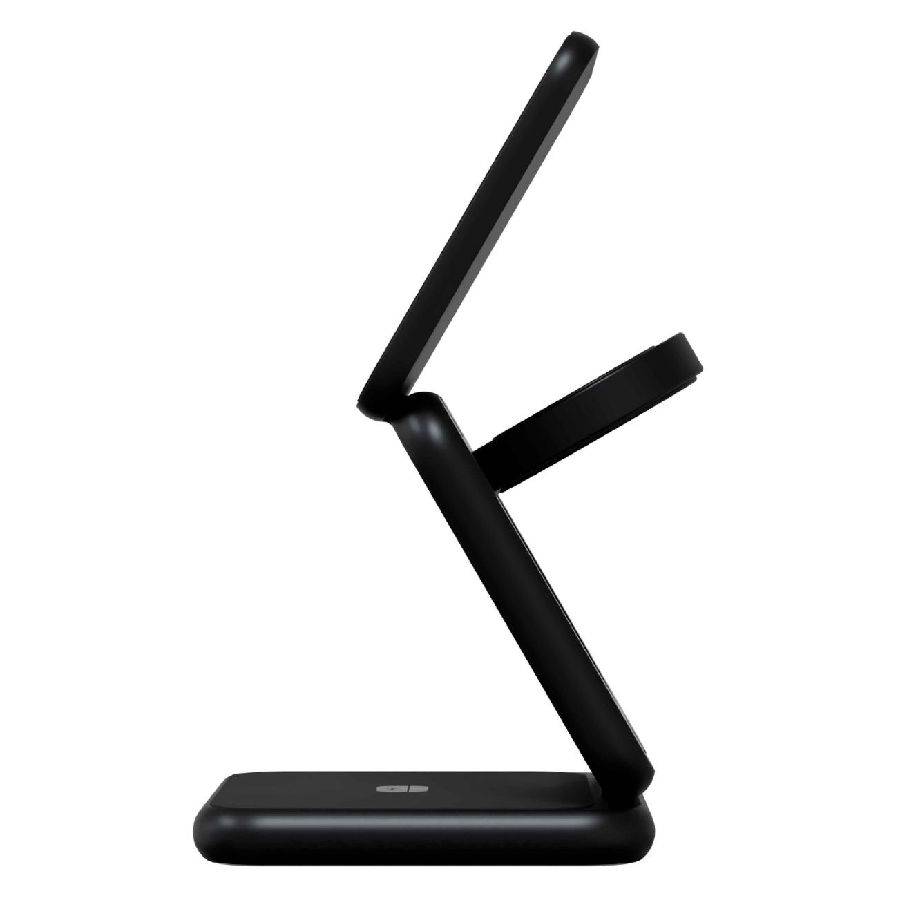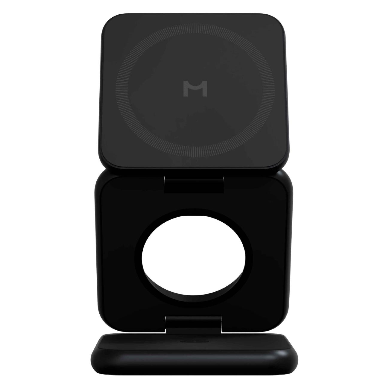 Беспроводное зарядное устройство Magssory Fold Pro 3 в 1 с магнитами — модель в черном корпусе, которая служит источником питания. Предназначено для настольного размещения. Предусмотрена совместимость с MagSafe.