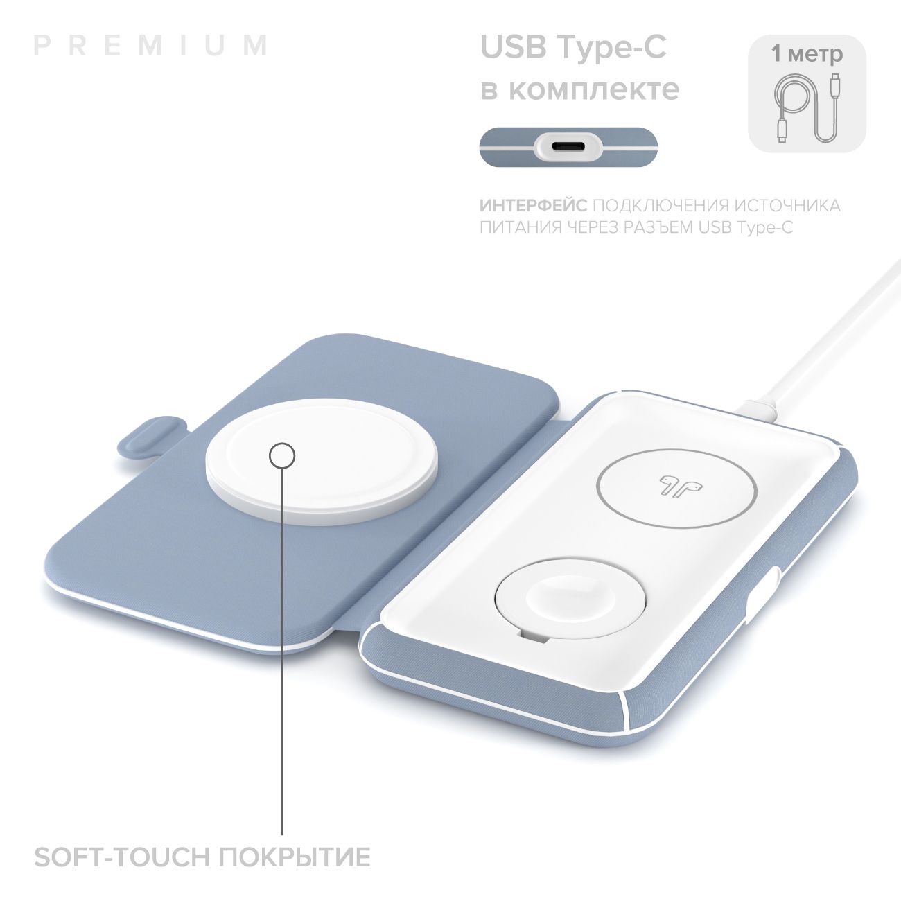 Заряжает всё и сразу. Очень удобно, можно одновременно зарядить телефон, часы и наушники, больше не таскаю три зарядки. MagSafe крепко держит, всё заряжается без проблем. Зарядка компактная, складная, кидаю её в рюкзак, когда еду в командировку. Аналогичные стоят дороже, а эта по цене и качеству ,супер. И главное, MFI, сертификация, так что можно не переживать за совместимость с айфоном и часами, это как оригинальная зарядка