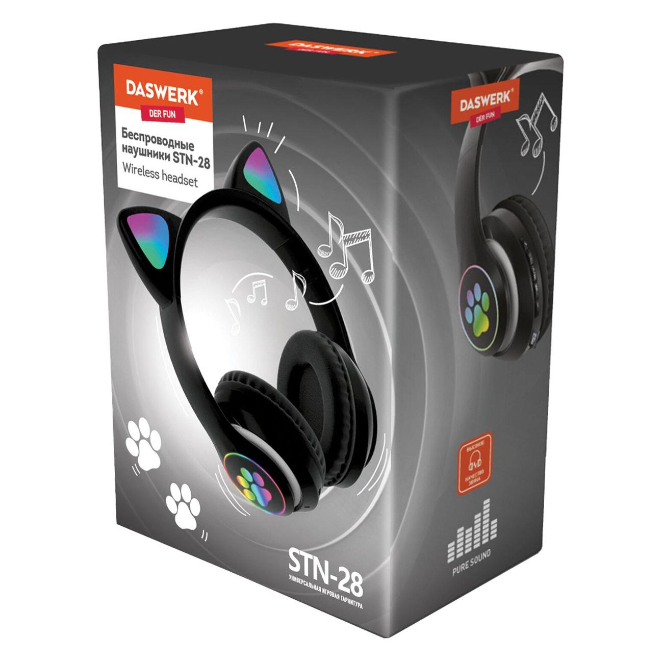 Черные игровые беспроводные наушники Daswerk STN-28 513803 с подсветкой и ушками работают до 12 часов за счет встроенного аккумулятора емкостью 400 мА*ч. Передача данных происходит за счет SD-card, Bluetooth версии 5.0, выхода 3,5 мм аудио, USB Type-C. Предусмотрено два канала звука. Микрофон с системой шумоподавления позволяет использовать аксессуар как гарнитуру. Чувствительность равна 100 дБ.