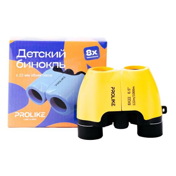 Детский бинокль Prolike 8x22 в корпусе черно-желтой расцветки оснащен мягкими силиконовыми наглазниками для максимально комфортной эксплуатации. Диаметр выходного зрачка и объективов бинокля составляет 22 мм. Кратность увеличения — 8х. Фокусировка механическая.