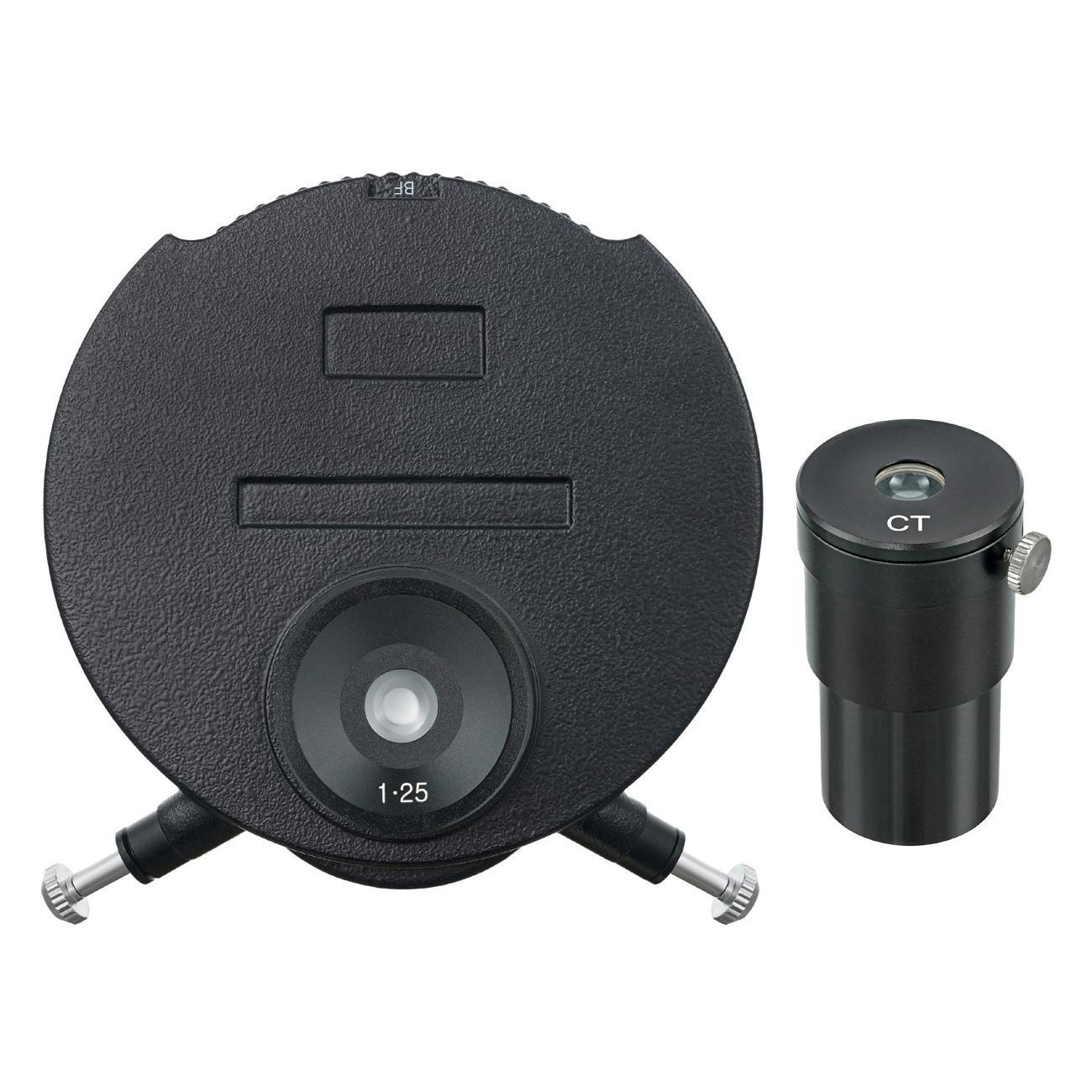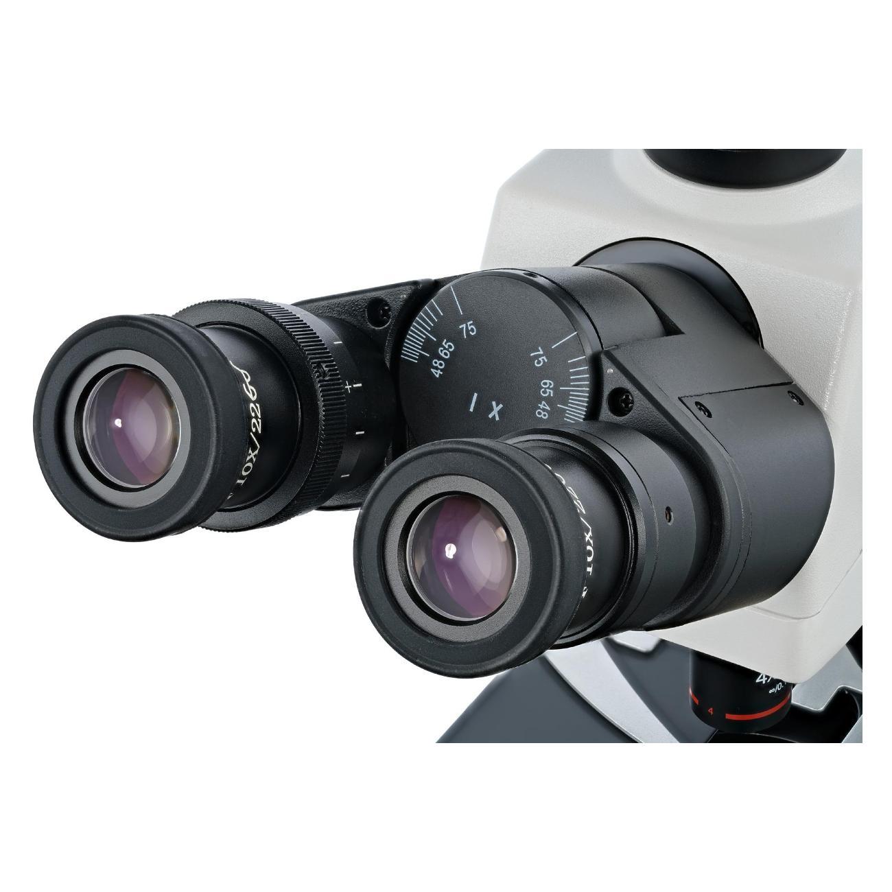 Тринокулярная насадка состоит из бинокулярной визуальной части и отдельной трубки для установки цифровой камеры. Насадка вращается на 360°, а визуальный блок отклонен на угол в 30°. Широкопольные окуляры с 10-кратным увеличением дают возможность работать с протяженными образцами. Диоптрийная коррекция помогает настроить их под особенности зрения наблюдателя.