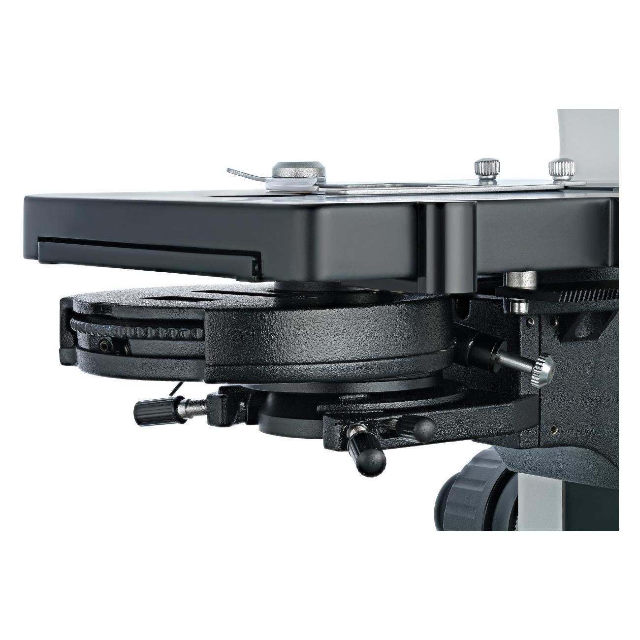 Предметный столик снабжен препаратоводителем, который делает работу с образцами более удобной. Рядом находятся ручки грубой и точной фокусировки. Под столиком расположены фазовый конденсор, держатель фильтра и яркая светодиодная подсветка, работающая от сети переменного тока. Яркость подсветки можно регулировать.