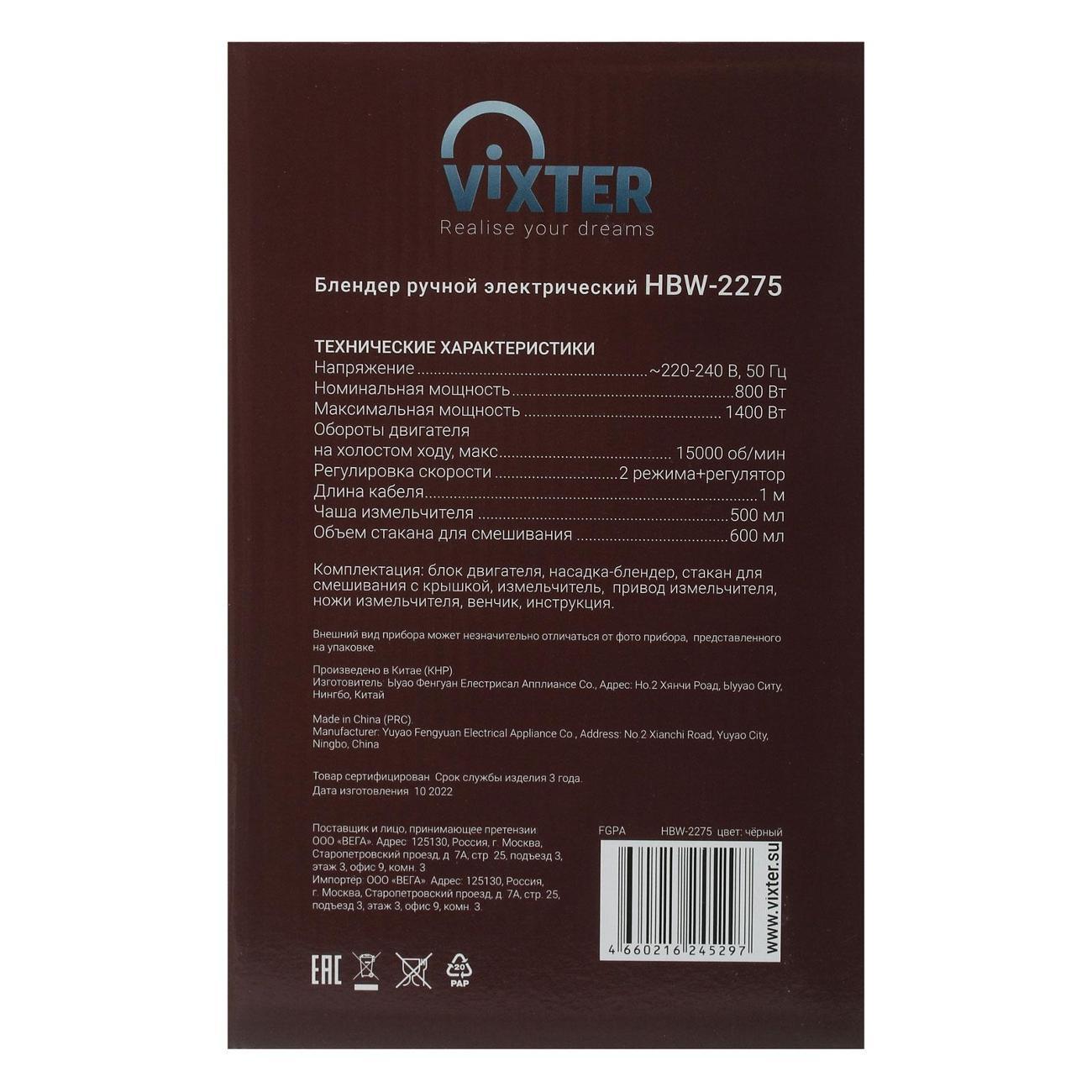 Вы можете купить Блендер погружной Vixter HBW-2275 в магазинах М.Видео по доступной цене. Блендер погружной Vixter HBW-2275: подробное описание, фото и отзывы реальных покупателей, характеристики, возможность скачать инструкции и подобрать аксессуары.