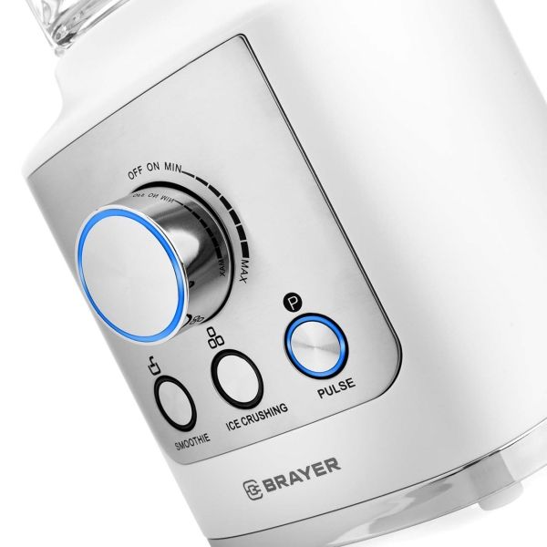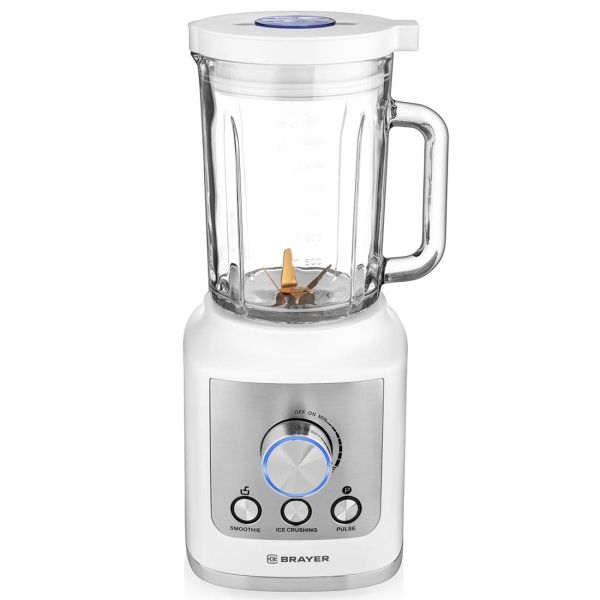 Стационарный блендер Brayer BR1200WH подключается к сети 220 В и работает с мощностью 1600 Вт. Габариты модели — 40х21х21 см.