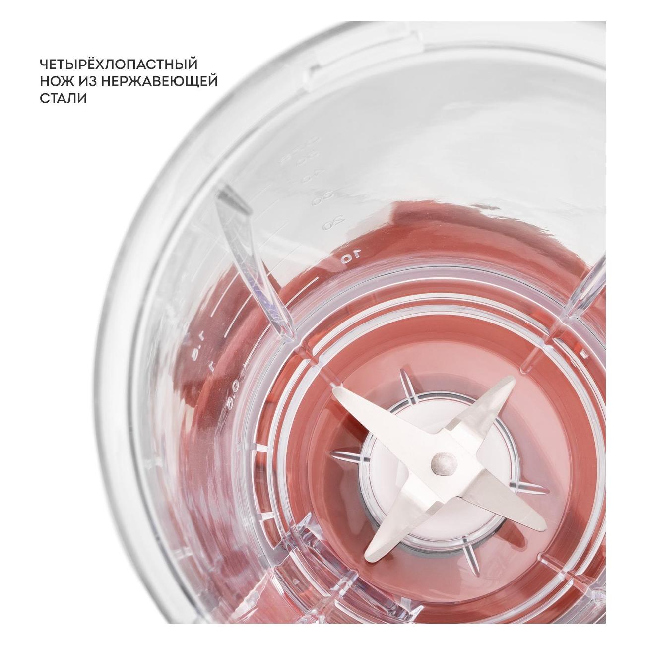 Нож с четырьмя лопастями выполнен из нержавеющей стали, он не подвержен коррозии и долго сохраняет заточку. Чаша и корпус изготовлены из пластика. Ножки прорезинены, за счет чего нейтрализуют вибрацию и предотвращают скольжение блендера по столешнице.