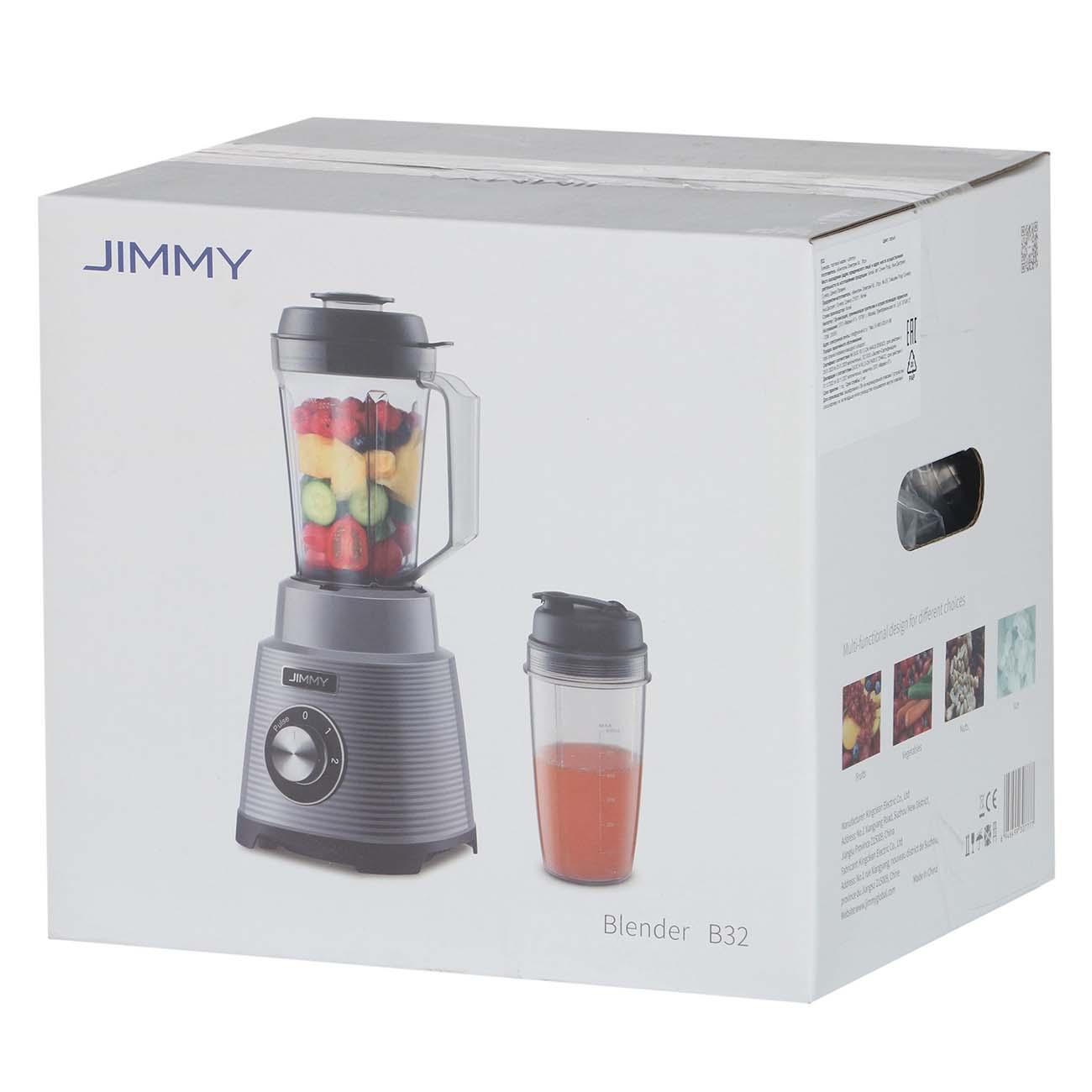 Стационарный блендер Jimmy B32 мощностью 700 Вт оснащен тремя скоростями работы и импульсным режимом, помогающим добиваться однородной консистенции. Управление осуществляется при помощи механического переключателя на передней части корпуса.
