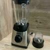 Чаши выполнены из прочного стекла. Объем составляет 1,2 л и 0,2 л (чаша кофемолки). Герметичная крышка предотвращает разбрызгивание, отверстие позволяет добавлять ингредиенты во время измельчения, колпачок может применяться как мерная емкость.