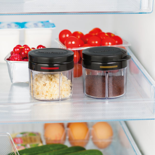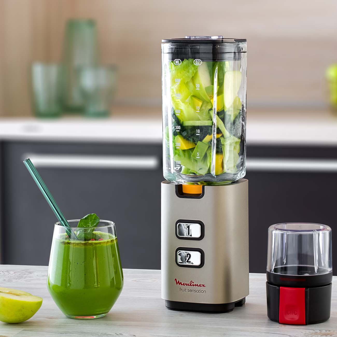 Блендер Moulinex LM142A26 – отличное решение для приготовления коктейлей и смузи на двоих, его чаша вмещает 0,6 литра. А кроме неё в комплект входят мини-измельчитель и мельничка объёмом по 250 мл. Домашний соус или молотые кофейные зёрна можно будет хранить прямо в них, не перекладывая в другие ёмкости, в комплект входят крышки. Управлять прибором очень просто: две скорости работы – две кнопки.