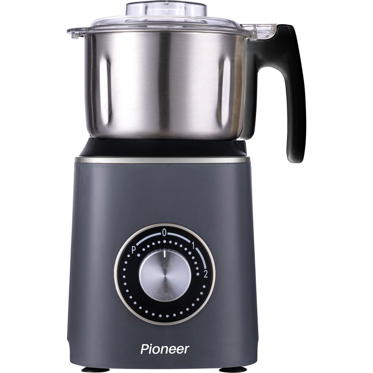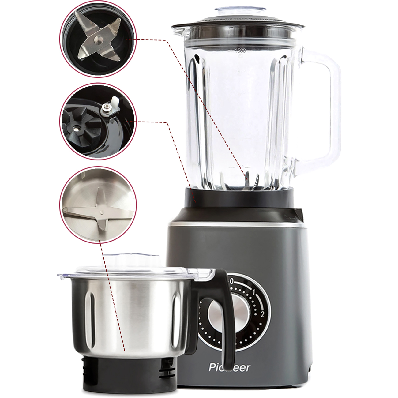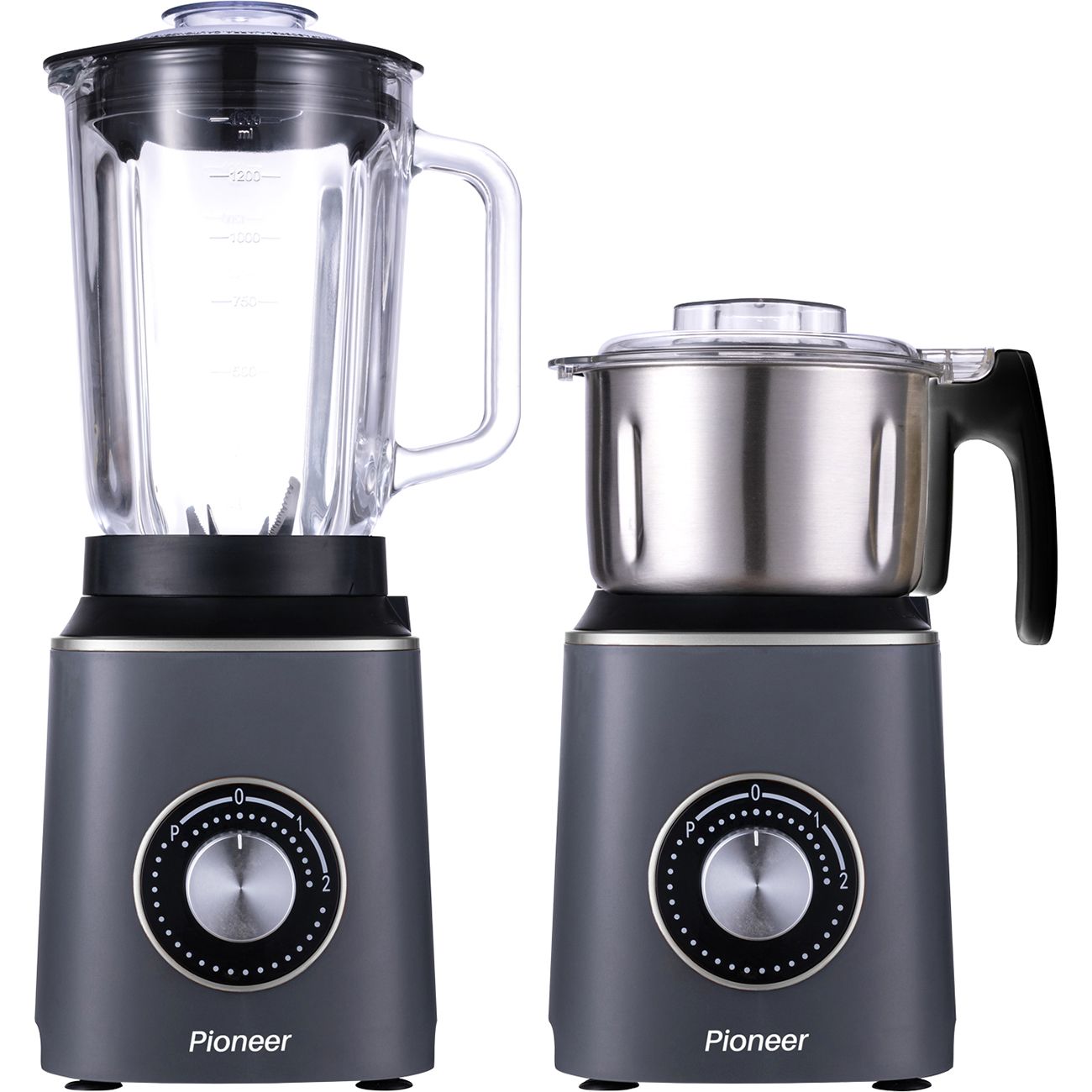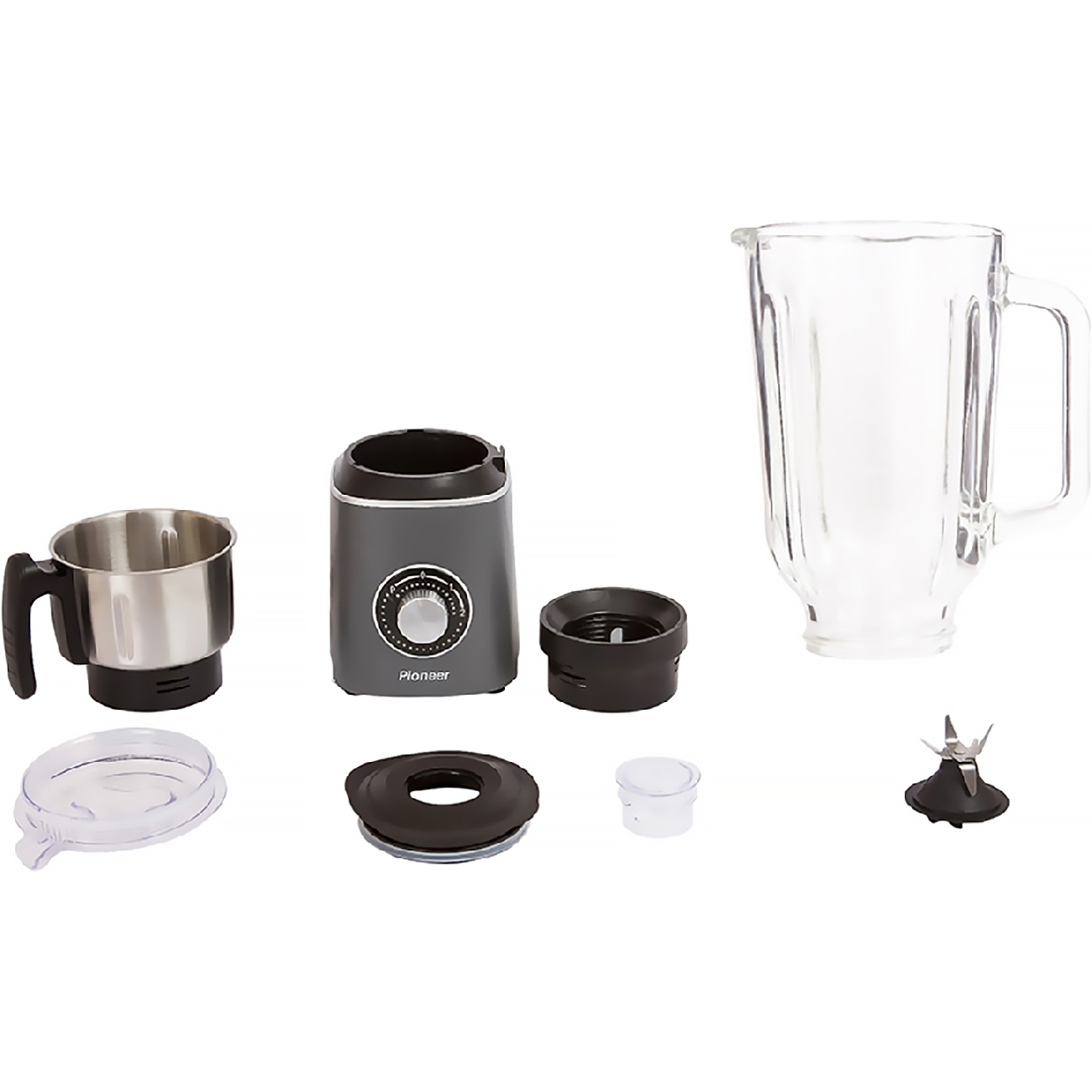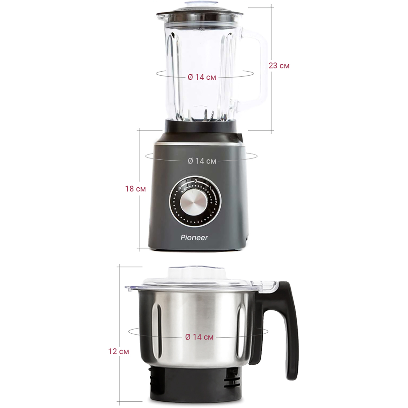 Стационарный блендер Pioneer SB146 выполнен в металлическом корпусе черно-серого цвета и поставляется в комплекте со стеклянным кувшином объемом 1,5 л и измельчителем объемом 500 мл. Модель может работать в двух скоростях, которые выбираются с помощью механического регулятора, и импульсном режиме. Есть противоскользящие ножки и защитная система от перегрева двигателя. Блендер работает на базе шести ножей, выполненных из нержавеющей стали. Размер устройства — 265х345х205 мм. Вес модели — 4,3 кг.