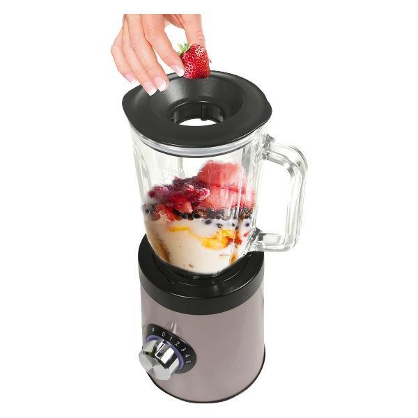1,5-литровый кувшин изготовлен из закаленного стекла, есть шкала для точного отмеривания ингредиентов и расчета порций. Крышка снабжена отверстием для добавления продуктов в процессе измельчения. Лезвия сделаны из нержавеющей стали, корпус выполнен из пластика. Габаритные размеры блендера: 19х15х39 см, вес — 3,1 кг.