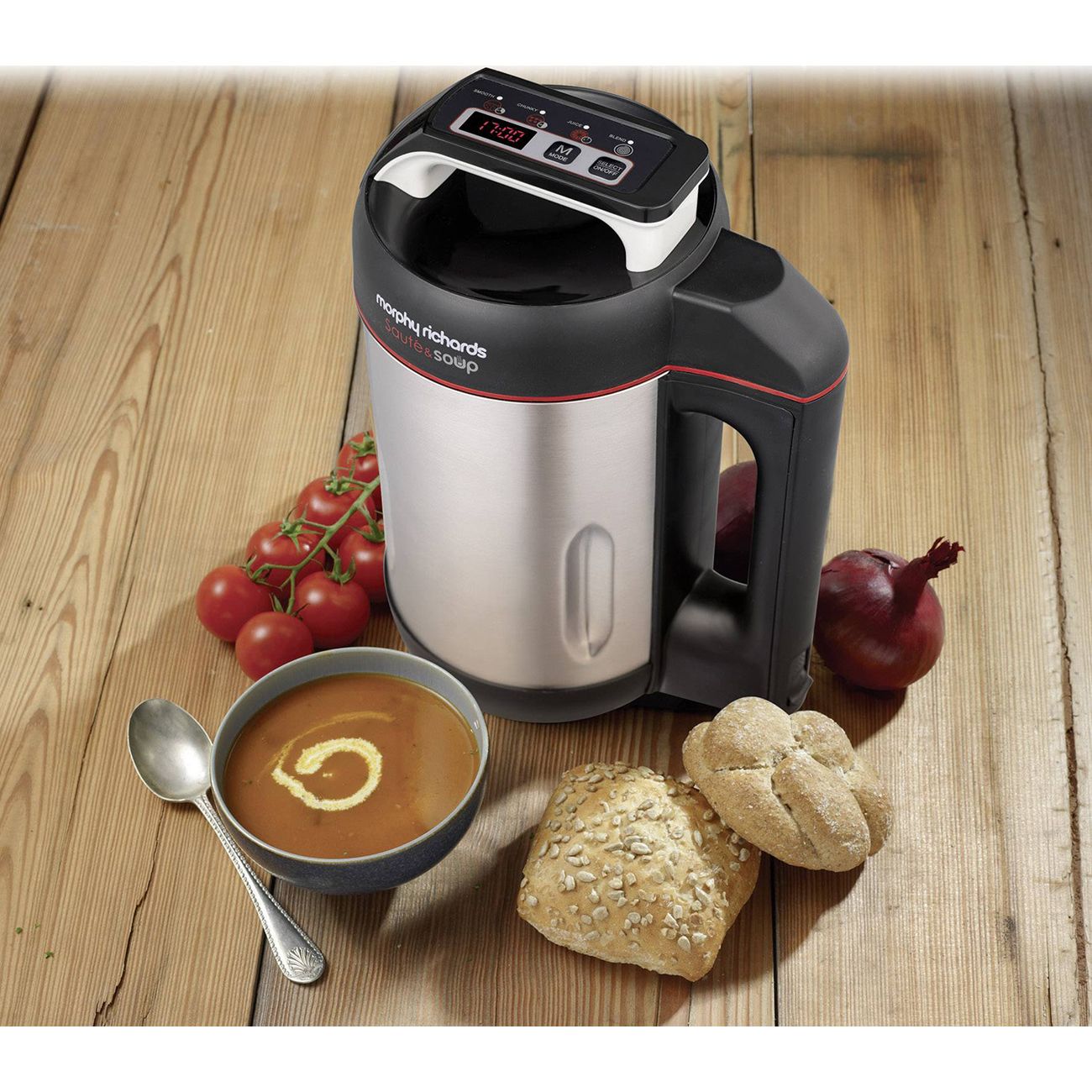 Блендер-суповарка Morphy Richards Saute and Soup 501014EE измельчит ингредиенты, сделает поджарку и приготовит суп за 20-28 минут. Он оснащен чашей объемом 1,6 л из нержавеющей стали с антипригарным покрытием.