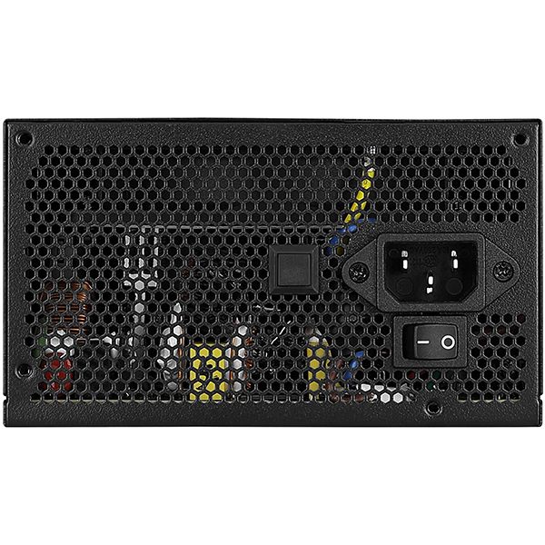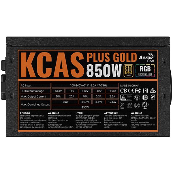 Черный блок питания для компьютера Aerocool 750W KCAS Plus Gold оснащен активной системой охлаждения (встроенный вентилятор размером 12 см). Присутствует защита от скачков напряжения, короткого замыкания, перегревания. Габариты модели — 15х8,6х14 см. Вес изделия — 2,28 кг. Мощность устройства — 840 Вт. Яркая подсветка RGB оснащена 13 предусмотренными режимами. В комплектацию входит стандартный набор проводов для подключения. Длина основного кабеля составляет 55 см. Число оборотов регулируется автоматически (максимально 1800 в минуту).