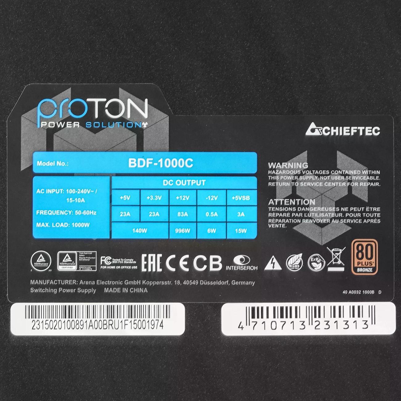 Вы можете купить Блок питания Chieftec Proton 1000W ATX BRONZE (BDF-1000C) в магазинах М.Видео по доступной цене. Блок питания Chieftec Proton 1000W ATX BRONZE (BDF-1000C): подробное описание, фото и отзывы реальных покупателей, характеристики, возможность скачать инструкции и подобрать аксессуары.