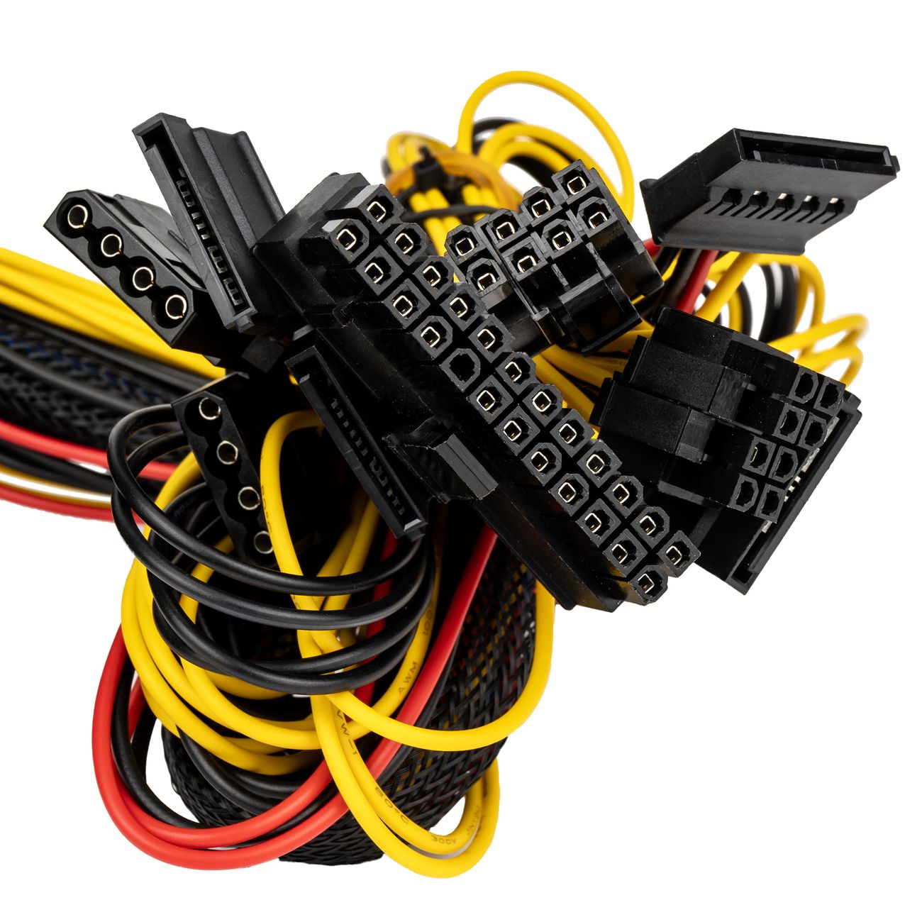 надежная конструкция блока, со всеми необходимыми коннекторами для подключения, его можно установит как на старые корпуса так и на корпуса с нижнем расположением блока питания, длина шлейфов это позволяет. В нем установлен широкий радиатор, который хорошо отводит тепло от нагревающихся элементов, так что он не перегревается