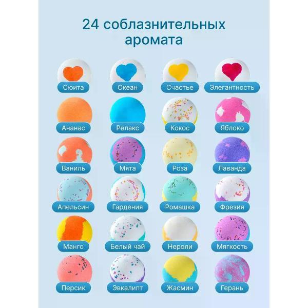 Качество на высоте: не пылят, не оставляют разводов, растворяются равномерно. Запахи разные, все приятные — не химические. 24 штуки хватает надолго. Очень рекомендую!
