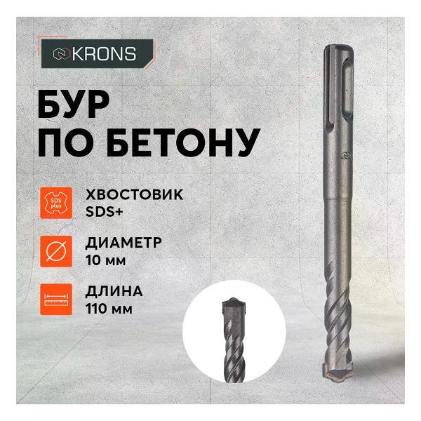 Бур по бетону KRONS SDS-Plus 10x110 мм. Бур по бетону KRONS для ударного сверления отверстий в бетоне, кирпиче, камне.Используется совместно с перфоратором.Особенности и преимущества:- сверло с прочной твердосплавной головкой;- паяная режущая часть крестовидной формы;- двойная спираль для эффективного отвода отходов бурения;- подходит для всех перфораторов со стандартом патрона SDS-Plus.. Диаметр (мм): 10; Общая длина (мм): 110; Хвостовик: SDS-Plus; Бренд: ; Страна производства: Китай; Вес : 0.055