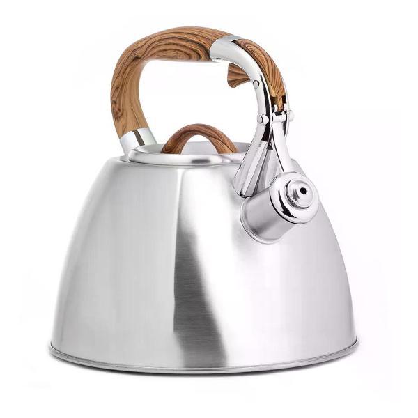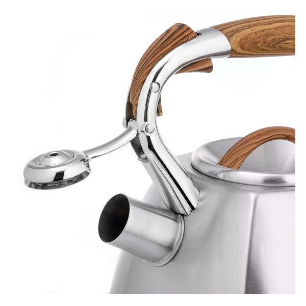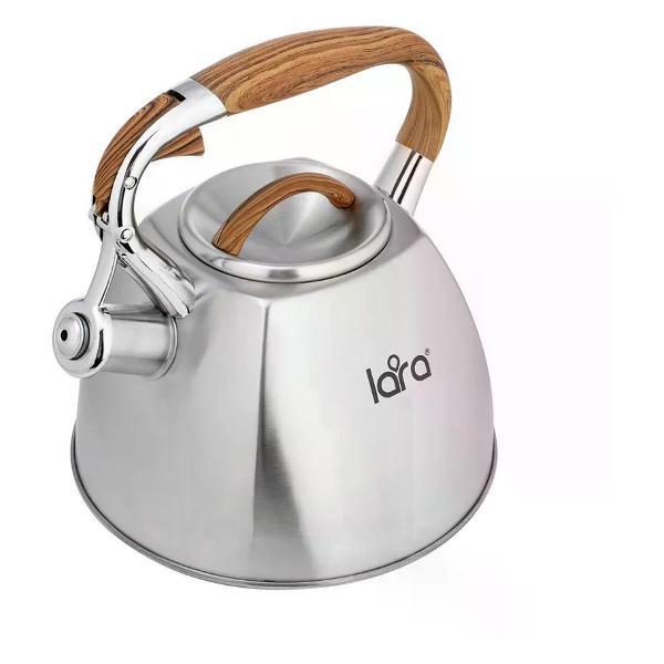 Современный чайник со свистком LARA в четырехгранном корпусе. Сочетание матовой полировки корпуса и деревянной фактуры придется по душе каждому. Объема чайника достаточно для небольшой семьи, поэтому нет необходимости лишний раз кипятить воду. Чайник изготовлен из высококачественной нержавеющей стали. Он оснащен свистком с безопасным кнопочным механизмом. Ручка из ненагревающегося пластика окрашена под дерево и имеет приятное на ощупь силиконовое покрытие Soft-touch. Стальное индукционное капсулированное дно подходит для всех типов плит Технические характеристики: Объем - 2, 8 л. Материал - Нержавеющая сталь AISI 201. Полировка - Матовая. Складная ручка - Нет. Дно - Индукционное, Капсулированное. Материал ручки - Силикон. Мытье - Ручная мойка Когда важна надежность и проверенная временем функциональность, чайник со свистком становится незаменимым атрибутом кухни. Чайник со свистком для газовой плиты обладает эргономичным дизайном и удобной ручкой. По соотношению цена-качество чайник со свистком Lara выгодно отличается от аналогов. Чайник для плиты Lara - это проверенное решение для любой кухни. Он подходит для всех типов плит и станет вашим надежным спутником в ежедневных приготовлениях. Эргономичный дизайн делает использование простым и комфортным.